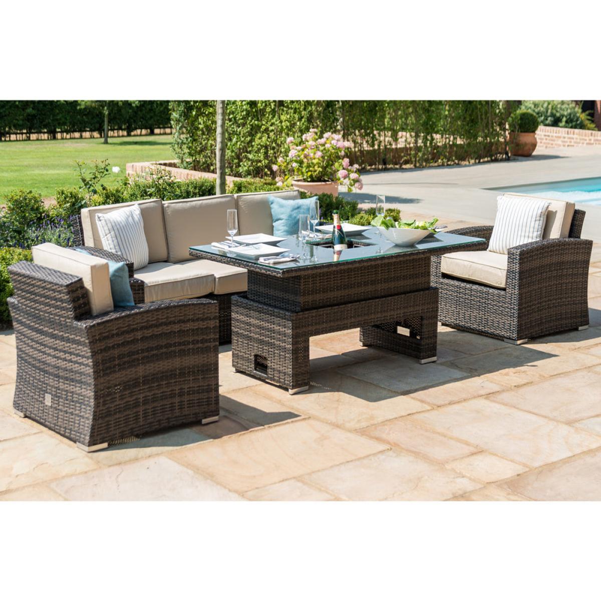 I really like this rising table with ice bucket because it offers versatility for both casual outdoor dining and more formal gatherings. Its rattan-style finish and neutral brown colour make it an easy fit in contemporary or rustic garden settings, especially when paired with neutral or earthy tones. The rise feature is practical for serving, allowing you to switch from a relaxed lounge height to dining height effortlessly. Styling tip: complement it with mix-and-match cushions and simple tableware for a laid-back look, or dress it up with lanterns and contemporary accessories for an evening event. It works well in both large garden spaces and smaller patios, adding functionality without compromising on style.