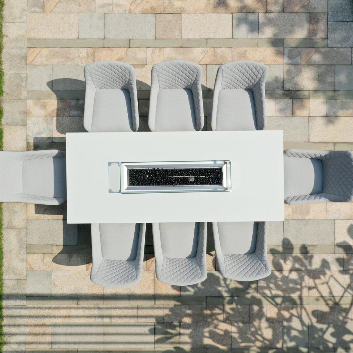 The Zest 8 seat rectangle fire pit outdoor dining set is a delightful synthesis of versatility, modernity and expressive style. The armchair is designed for maximum comfort, with a playful style to craft the look of your outdoor dining. The Fire Pit table will allow you to extend lazy afternoons, long into the evening too. All of our Fire Pit systems are CE registered and have a BTU of 50,000 (British Thermal Unit is a unit that measures the heat generated by the burner). On average, depending on the setting used, our Fire Pits will produce approximately 6-7 hours use for a 7KG gas bottle. We recommend using a propane gas bottle, which can be stored underneath the table. Dimensions:Zest Fabric Chairs - H: 86 x W: 66 x D: 84 cm. Spray Stone Dining Table - H: 75 x W: 215 x D: 90 cm Set Includes:8 x Zest Chairs1 x Firepit System1 x Glass Surround1 x Grill Plate & Shelf1 x Black Fire Stone. Made from Recycled Materials. Water & Stain ResistantUV and Fade Resistant Fabric Quickdry Foam Frost Resistant Fabric