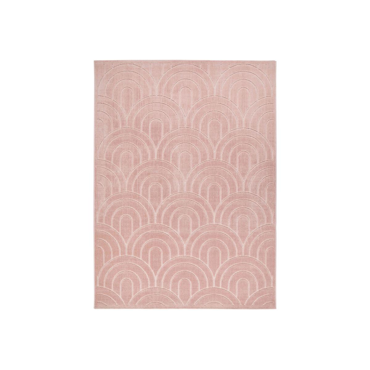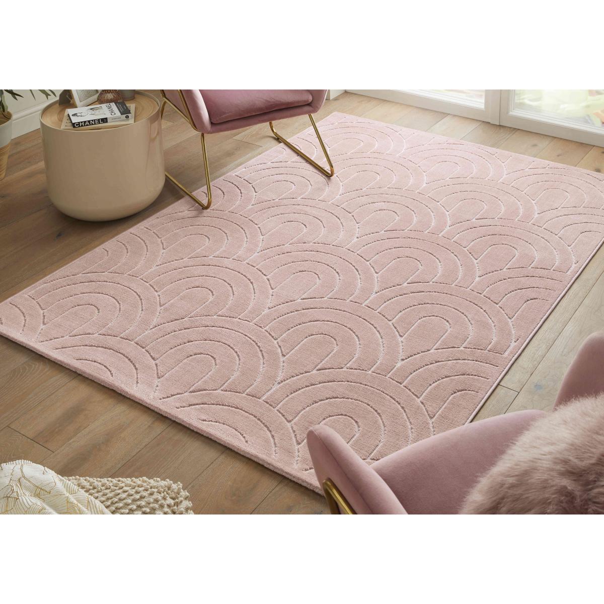 This stylish dusty pink rug’s geometric arch pattern brings to mind classic Art Deco designs and is just as sophisticated. Why you'll love it Chic and modern rug with an Art Deco-inspired design. Gentle curves and arches create a pleasing and elegant pattern. In a soft dusty pink. Carved pattern creates a multi-dimensional high and low pile. Machine woven for durability. Available in a choice of sizes. Understated and stylish, this rug looks perfect in any room. This rug is part of the Furniture Village home accessories collection. What you need to know 6 mm pile. 100% microfibre polyester. For indoor use only. Vacuum regularly using a suction vacuum cleaner. Blot stains; do not rub.