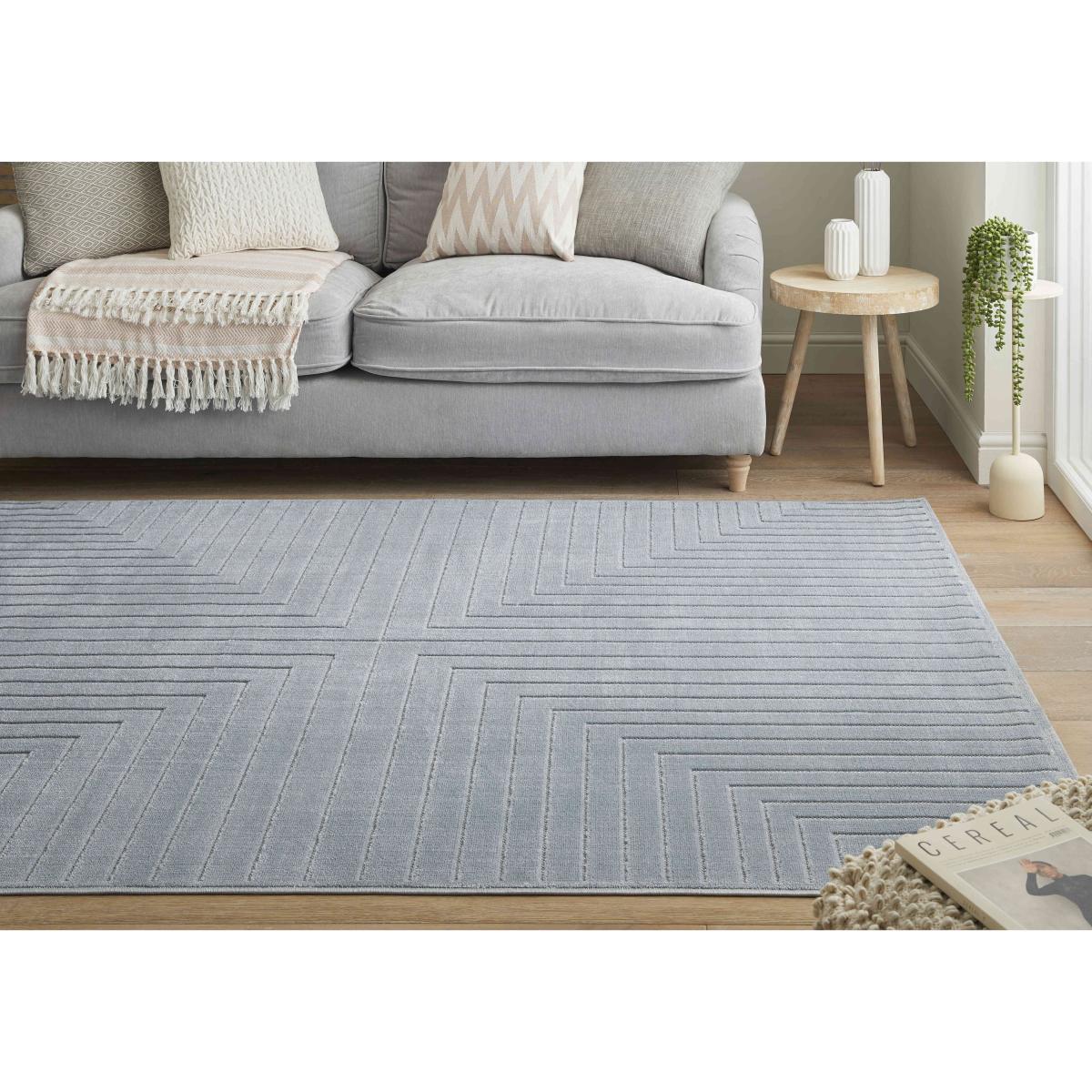 Simple yet striking, this blue rug’s geometric design of intersecting lines feels both modern and timeless. In a soft mid-blue, it’s versatile as well as stylish. Why you'll love it Chic and contemporary rug makes a bold geometric statement. Simple pattern of intersecting lines. In a versatile mid-blue. Carved pattern creates a multi-dimensional high and low pile. Machine woven for durability. Available in a choice of sizes. Understated and stylish, this rug looks perfect in any room. This rug is part of the Furniture Village home accessories collection. What you need to know 6 mm pile. 100% microfibre polyester. For indoor use only. Vacuum regularly using a suction vacuum cleaner. Blot stains; do not rub.