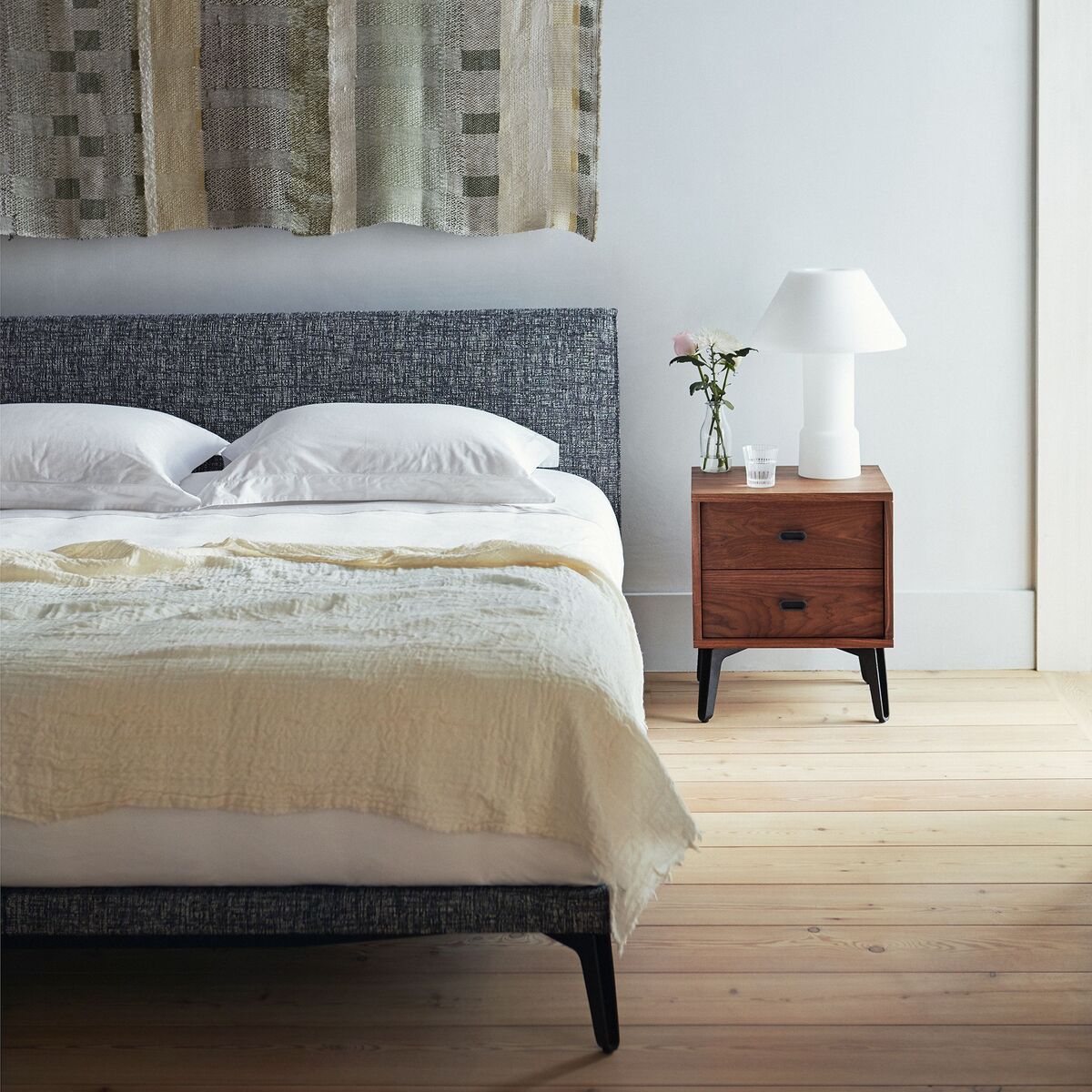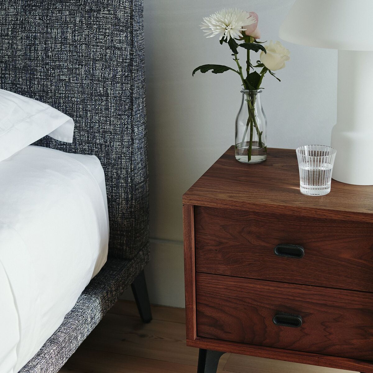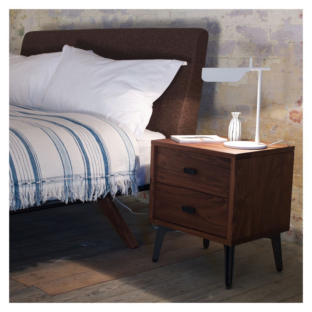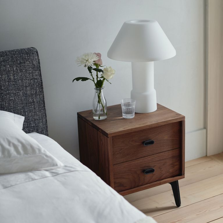 Designed by Matthew Hilton, the walnut Mc Queen Bedside Chest uses generous planes of solid natural walnut wood to create an elegant form that resonates with simplicity. The bedside chest itself is a coherent, elegant form featuring two drawers with cast iron handles, all balanced on subtly slanted cast iron legs that complement the Danish-oiled walnut's dark grain. Its quietly functional structure is approachable yet contemporary and would make an enduring addition to your bedside area, or even as a side table in your living space. Manufactured by De La Espada's expert craftspeople for Matthew Hilton, the Mc Queen Bedside Chest's clean lines and timeless composition are endlessly appealing. Matthew Hilton is renowned as one of Britain's most esteemed industrial designers and has designed for leading manufacturers across the world, over an illustrious career spanning 30 years.