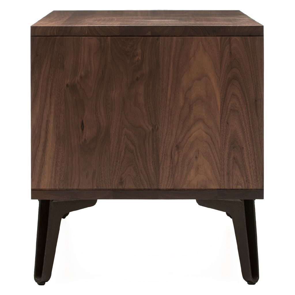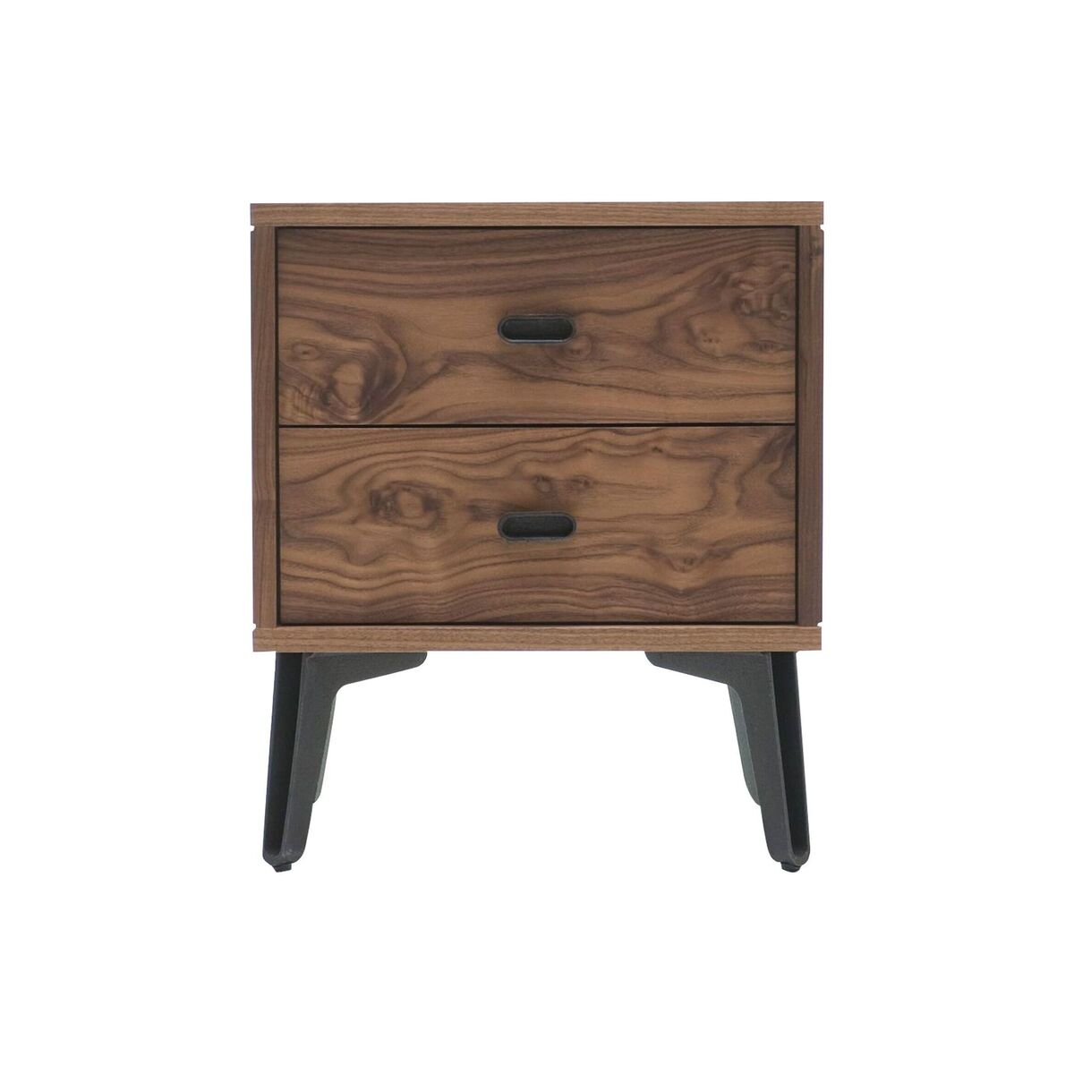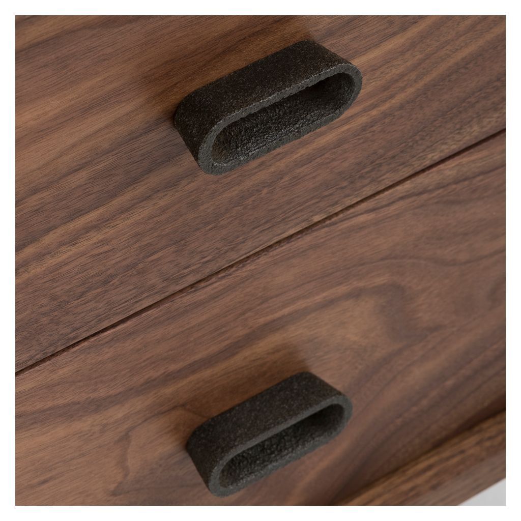 Designed by Matthew Hilton, the walnut Mc Queen Bedside Chest uses generous planes of solid natural walnut wood to create an elegant form that resonates with simplicity. The bedside chest itself is a coherent, elegant form featuring two drawers with cast iron handles, all balanced on subtly slanted cast iron legs that complement the Danish-oiled walnut's dark grain. Its quietly functional structure is approachable yet contemporary and would make an enduring addition to your bedside area, or even as a side table in your living space. Manufactured by De La Espada's expert craftspeople for Matthew Hilton, the Mc Queen Bedside Chest's clean lines and timeless composition are endlessly appealing. Matthew Hilton is renowned as one of Britain's most esteemed industrial designers and has designed for leading manufacturers across the world, over an illustrious career spanning 30 years.
