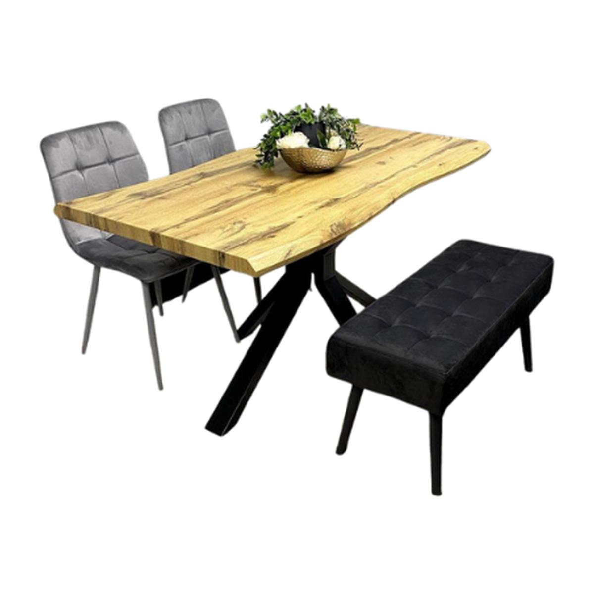 This beautifully designed dining table set comes with a durable 40mm veneer wood tabletop featuring a natural curved-edge design. The powder-coated X-shaped iron legs provide exceptional stability, supporting a sophisticated look. The set includes elegant tufted grey velvet chairs with padded seats and backs, alongside a grey velvet bench with stylish stitched tufting and sturdy metal legs. Easy-to-follow instructions ensure quick and simple assembly. Features Durable 40mm veneer wood tabletop with a natural curved-edge design. Powder-coated X-shaped iron legs for maximum stability. Elegant tufted grey velvet chairs with padded seats and backs. Black velvet bench with stitched tufting and metal legs. Clear and easy-to-follow instructions for quick setup.
