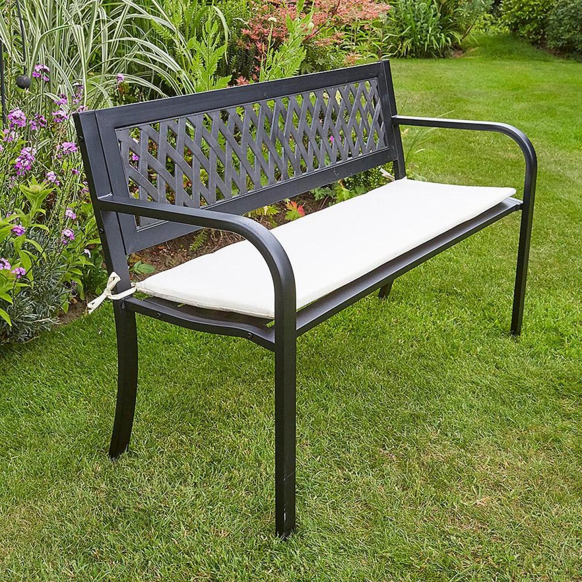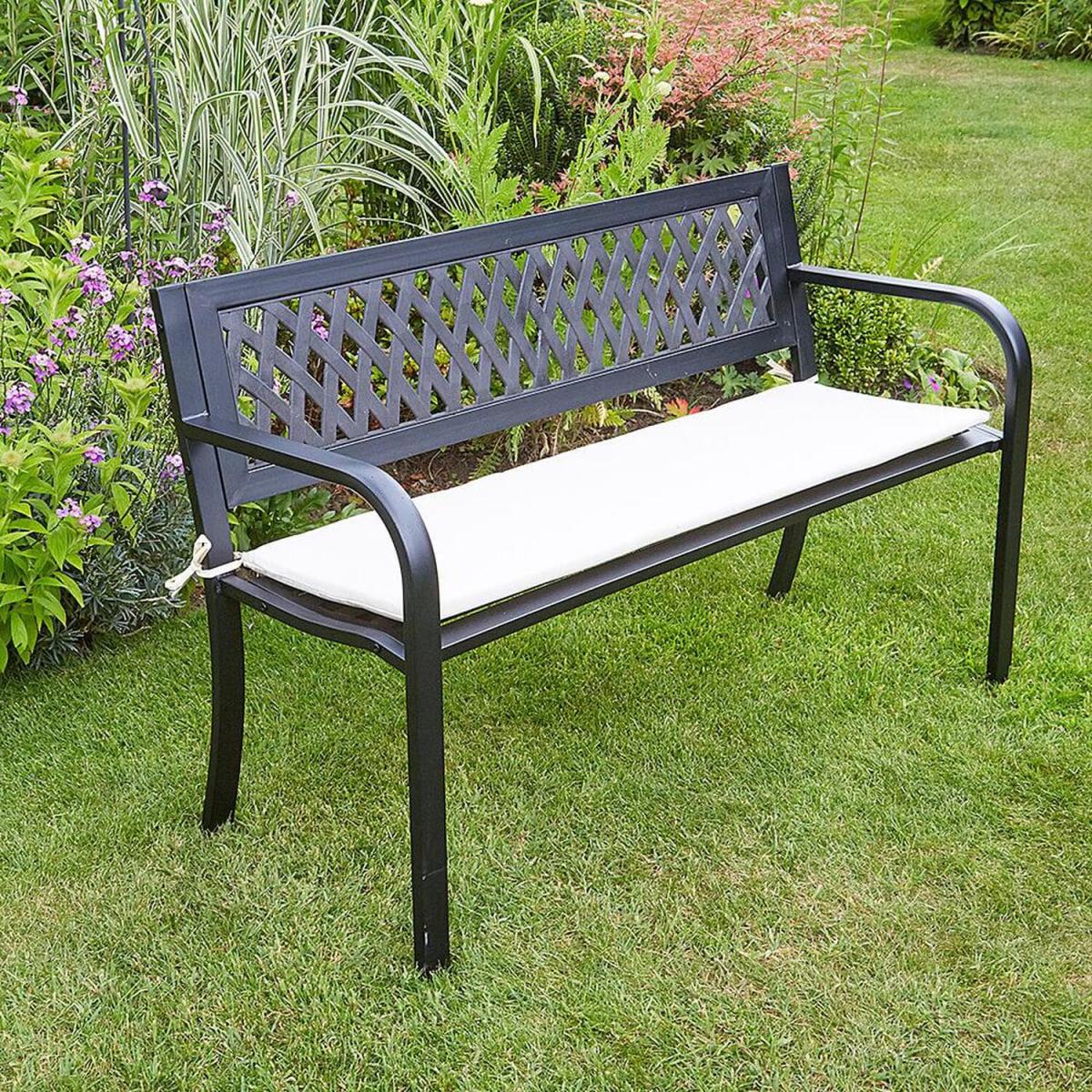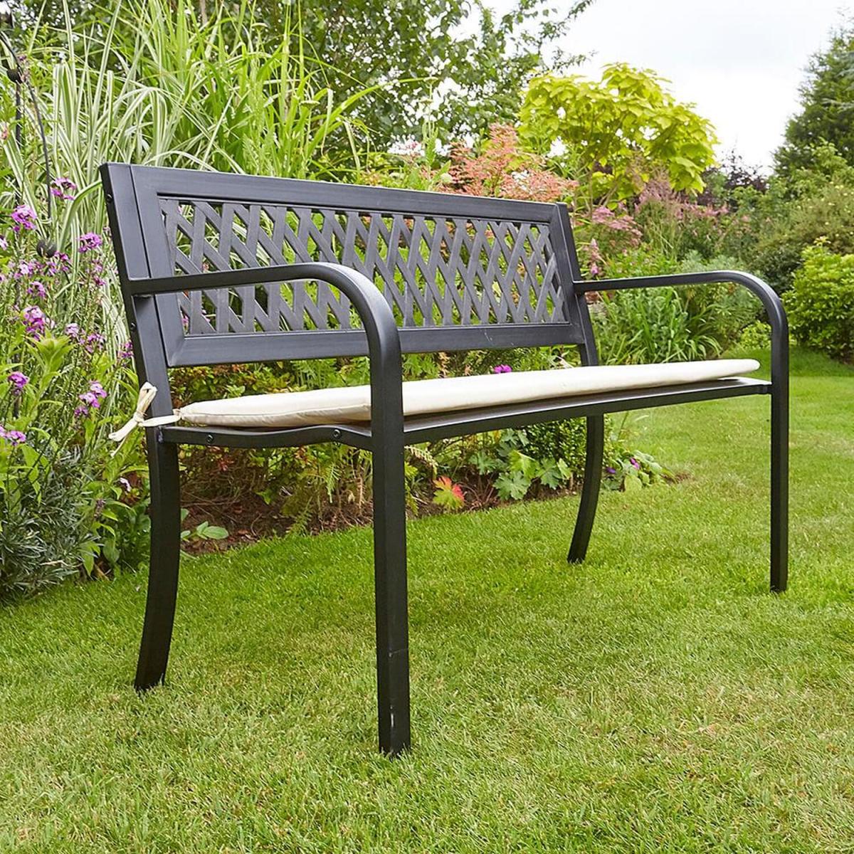 Our smart matt Black Meadow Garden Bench is the ideal outdoor seat. It's crafted in metal and has single seat and a daisy-style diamond pattern on the back. No longer need you search for superb garden furniture as our Meadow Garden Bench is here. It has a diamond-patterned back to create delightful light and as the sun shines through it. Made from high quality metal and painted to a smart matt Black, our Meadow Garden Bench is just made for your garden. Enjoy it in a sunny spot on your patio or in your garden and enjoy some well-deserved chill out relaxation with a drink, a book or some snacks. Please Note We recommend a cover to help protect your furniture or to store it inside from the elements during the colderwetter seasons.