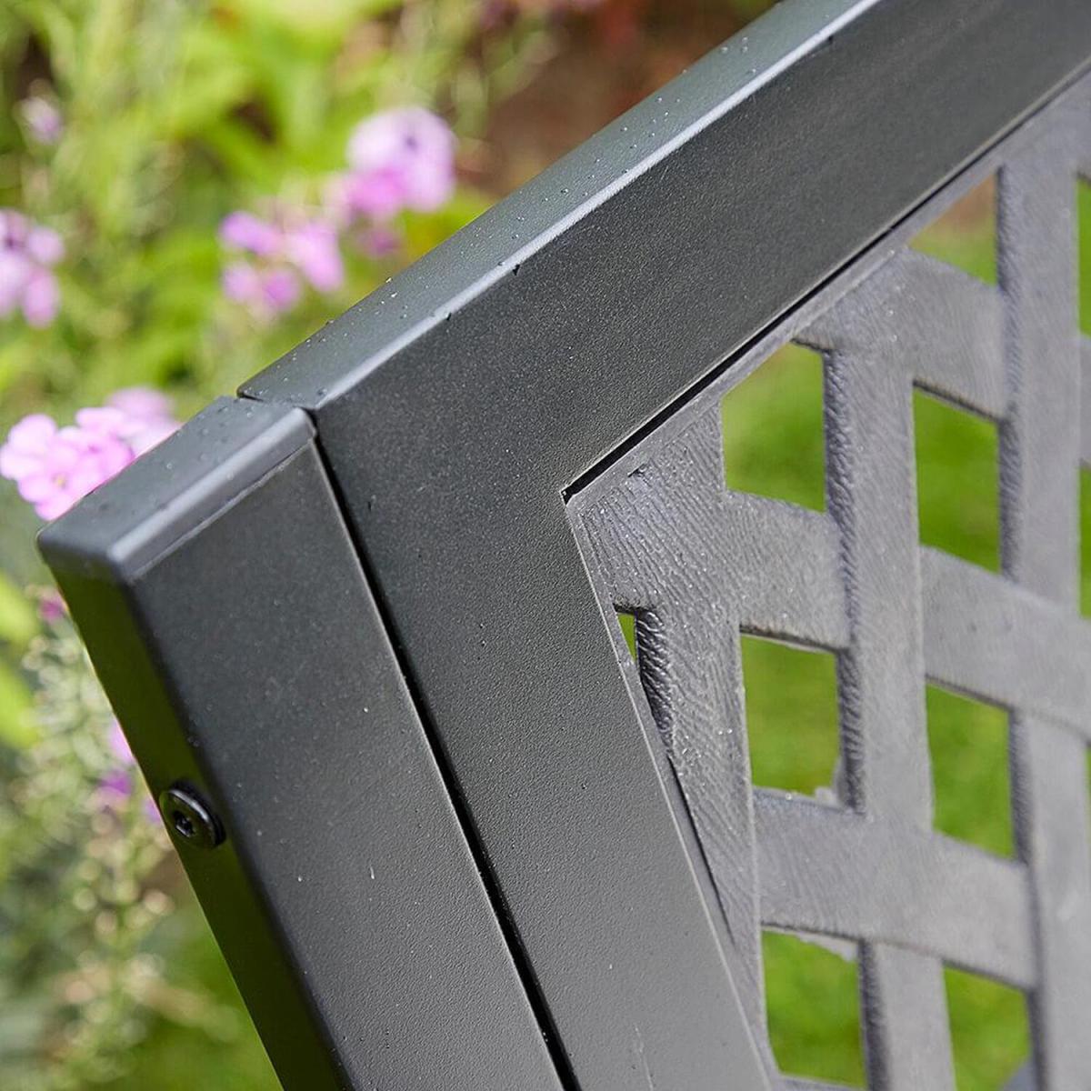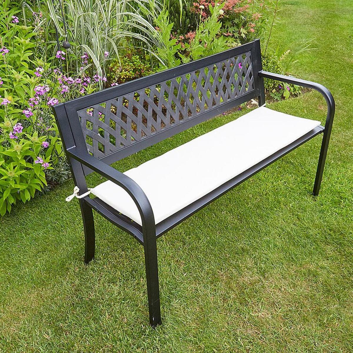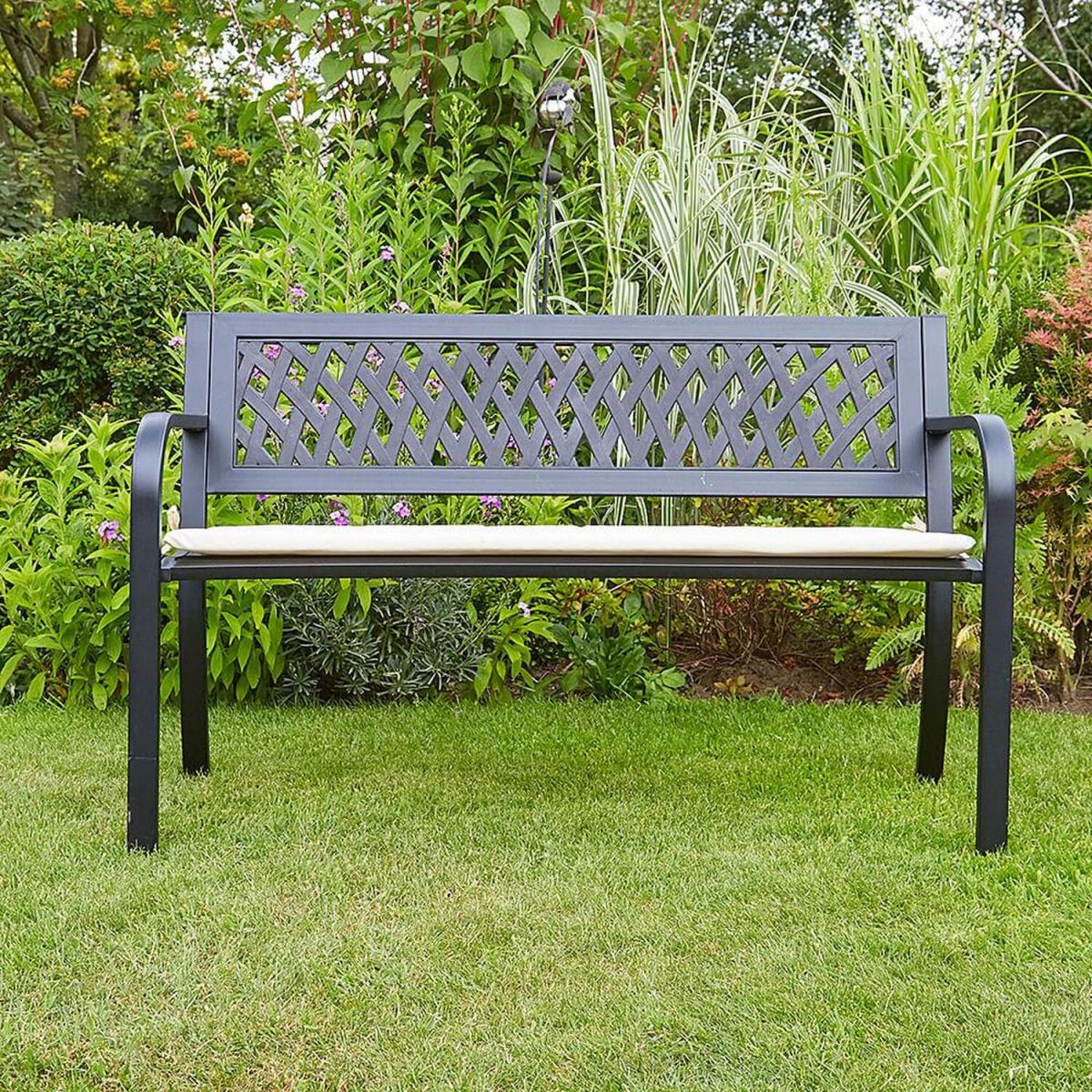 Our smart matt Black Meadow Garden Bench is the ideal outdoor seat. It's crafted in metal and has single seat and a daisy-style diamond pattern on the back. No longer need you search for superb garden furniture as our Meadow Garden Bench is here. It has a diamond-patterned back to create delightful light and as the sun shines through it. Made from high quality metal and painted to a smart matt Black, our Meadow Garden Bench is just made for your garden. Enjoy it in a sunny spot on your patio or in your garden and enjoy some well-deserved chill out relaxation with a drink, a book or some snacks. Please Note We recommend a cover to help protect your furniture or to store it inside from the elements during the colderwetter seasons.