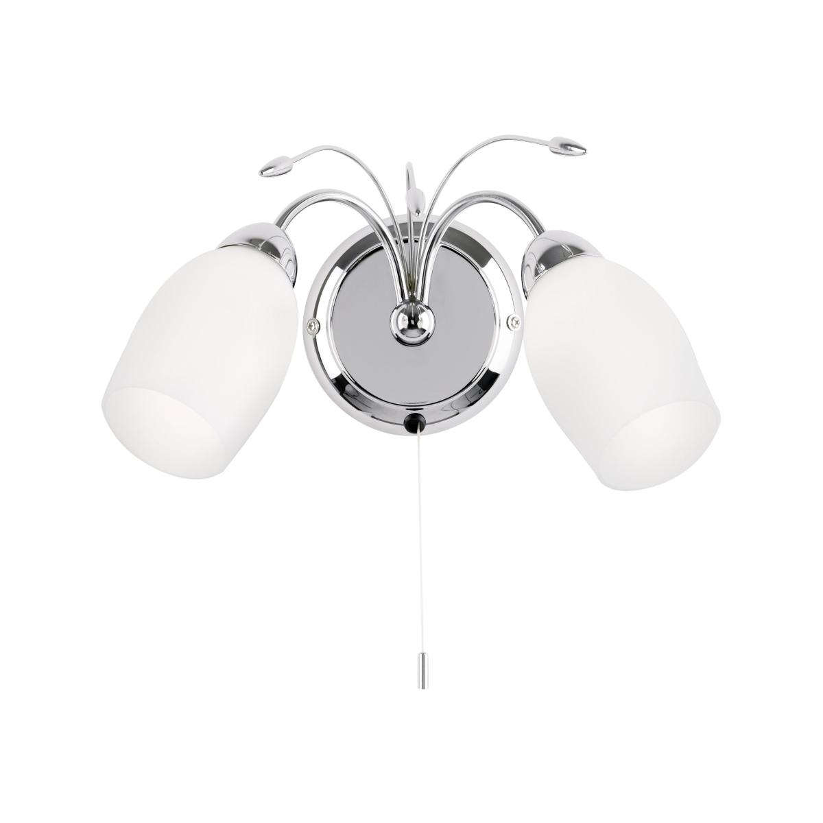 Twin wall light with down-facing opal glass shades, and finished in chrome effect plate. Supplied with pull cord switch. Dimmable and suitable for use with LED lamps. Matching items and other colour options available.