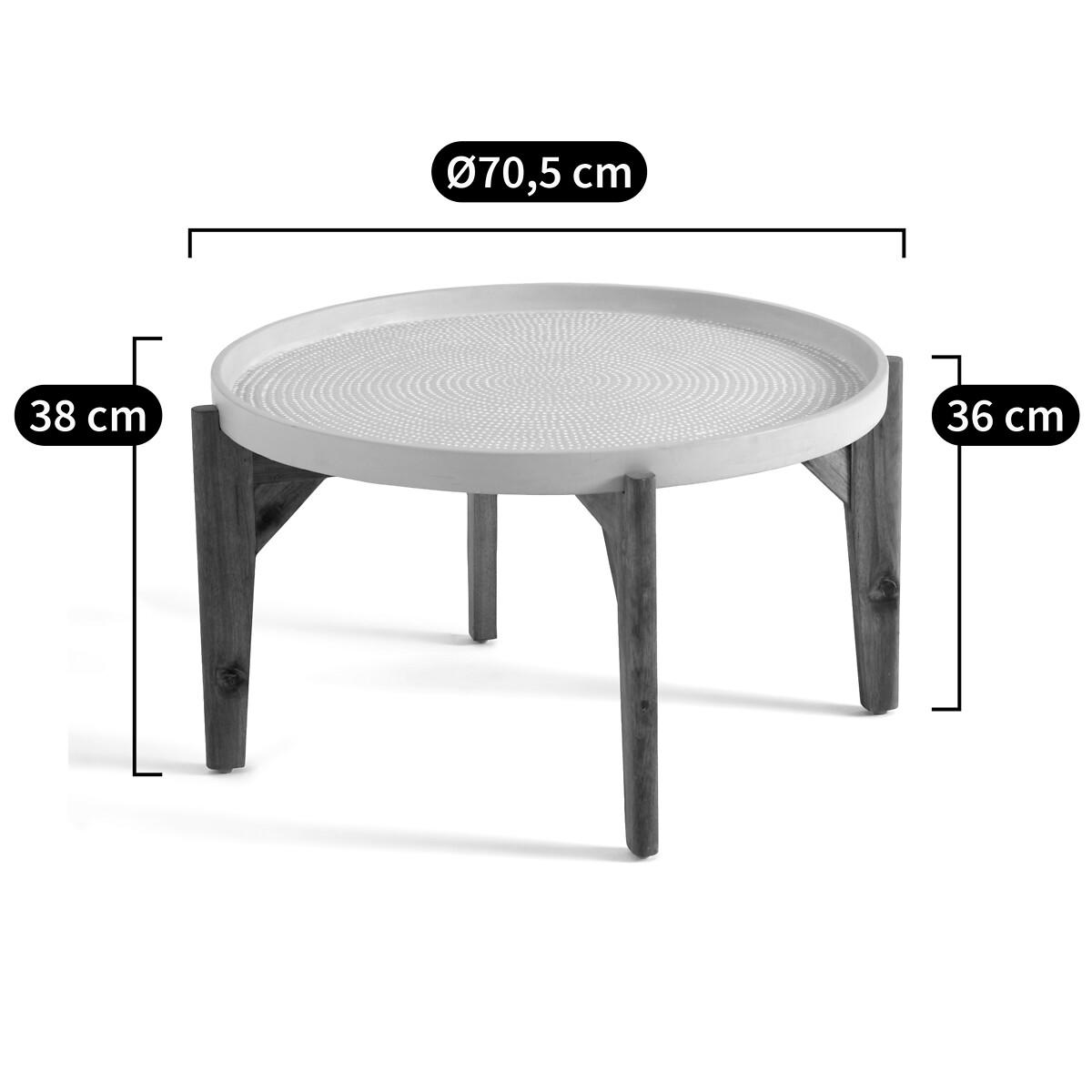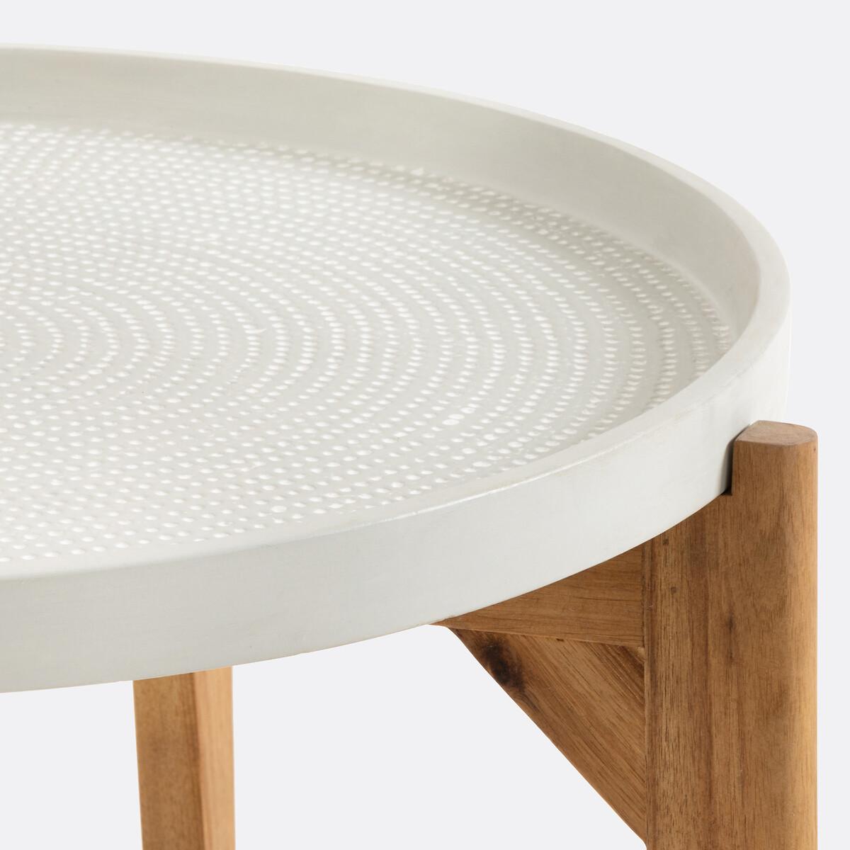 Cement fibre tabletop with hammered pattern, and acacia base. The Médan end table will bring a touch of Bohemian style to a balcony, a garden or on a terrace.. Product Details • Hammered pattern round top in cement fibre • Acacia base, tinted oiled finish, natural colour Quality Info • Acacia is a wood that offers good mechanical properties (good resistance to insects and fungi) and is resistant to bad weather (alternation of dry and humid periods). Dimensions Overall • Diameter: 70.5cm • Height: 38cm • Height of legs: 36cm • Table height: 4cm/1.5"Delivery:Assembly required. Available for home delivery. Note! Please check that all access points are large enough to accommodate your delivery (doors, stairs, lifts). • WOOD FROM SUSTAINABLY MANAGED FORESTS. FSC® certified wood comes from forests that are environmentally, socially and economically well managed. Dimensions and weight of parcel:1 parcel • L75 x H15 x D75cm. 14kg.
