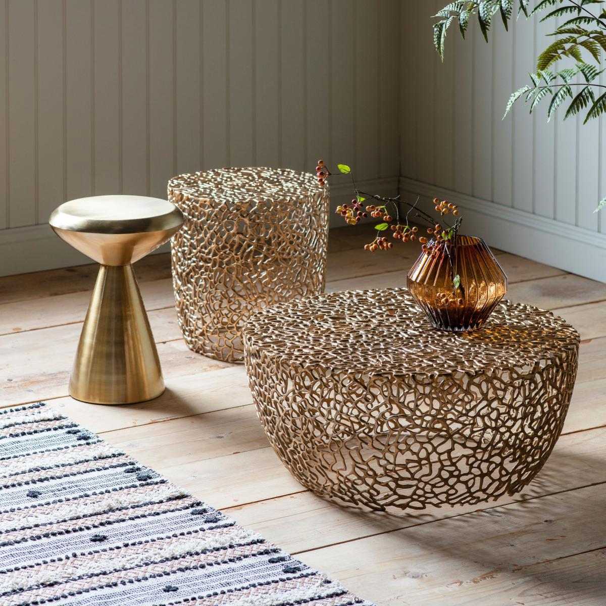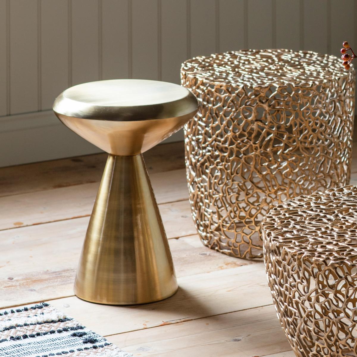 I love this gold side table for its striking metallic finish and sculptural form, making it a versatile statement piece. It works particularly well in modern or eclectic interiors, adding a touch of glamour to living rooms or bedrooms. Practical styling tips include using it to display a small gallery of favourite vases or candles, or simply as a stand for a drink and book when entertaining. Its bold shape lends itself to minimal styling, but it can also complement textured fabrics and layered accessories for a more layered look. Its reflective surface instantly lifts the space, making it an excellent choice for enhancing smaller or dimly lit rooms.