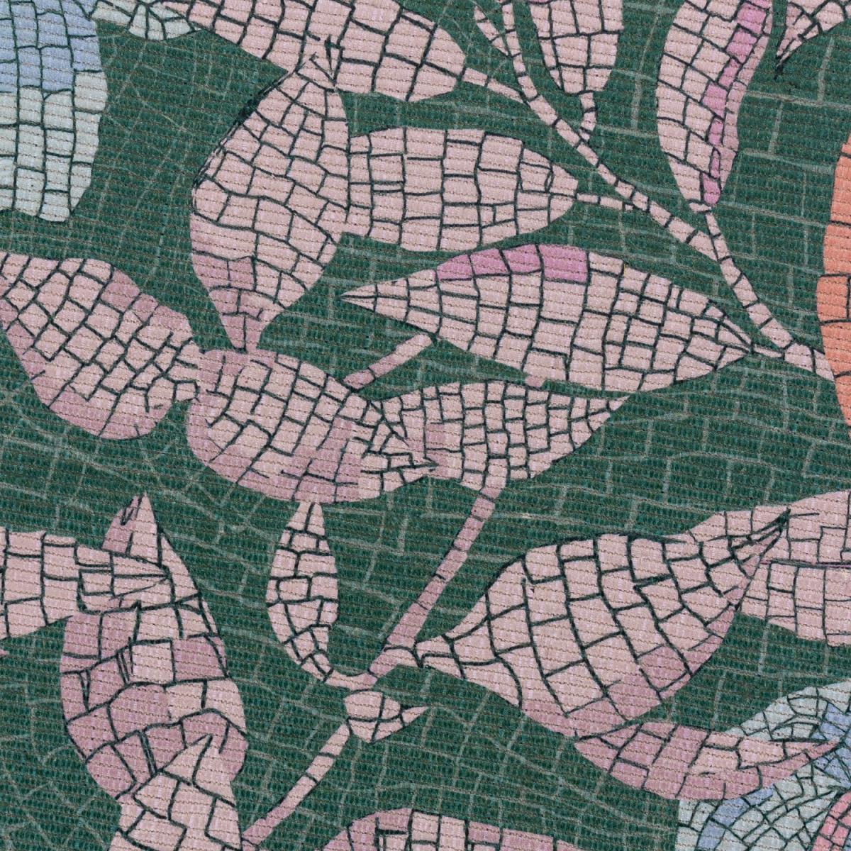 Featuring a digitally printed Mediterranean-influenced patterned mosaic tile effect with fruits and florals, on a polyester flatweave base with a rich dark green background.