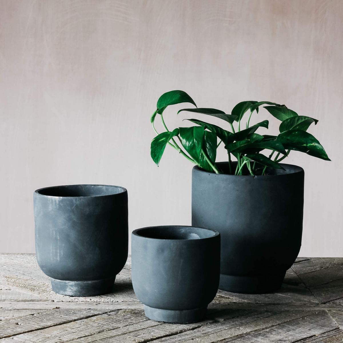 This minimalistic black planter collection is crafted from cement and features a rustic, uneven finish. Suitable for indoor and outdoor use this plant pot is perfect for housing an array of foliage.