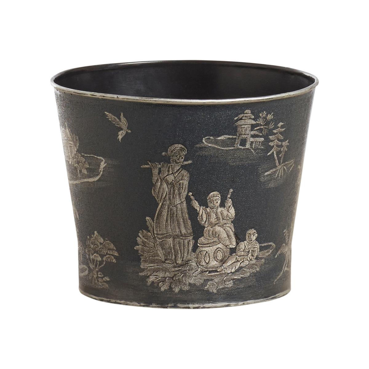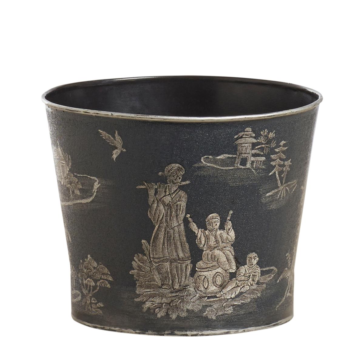 Taking its name from a painter from the Ming Dynasty period, the Medium Gonglin Planter features a chinoiserie design inspired by traditional Chinese paintings; decorative detailing that stands out against a dark backdrop. This piece holds a plant (ideally faux) with a 17. 5cm diameter base.