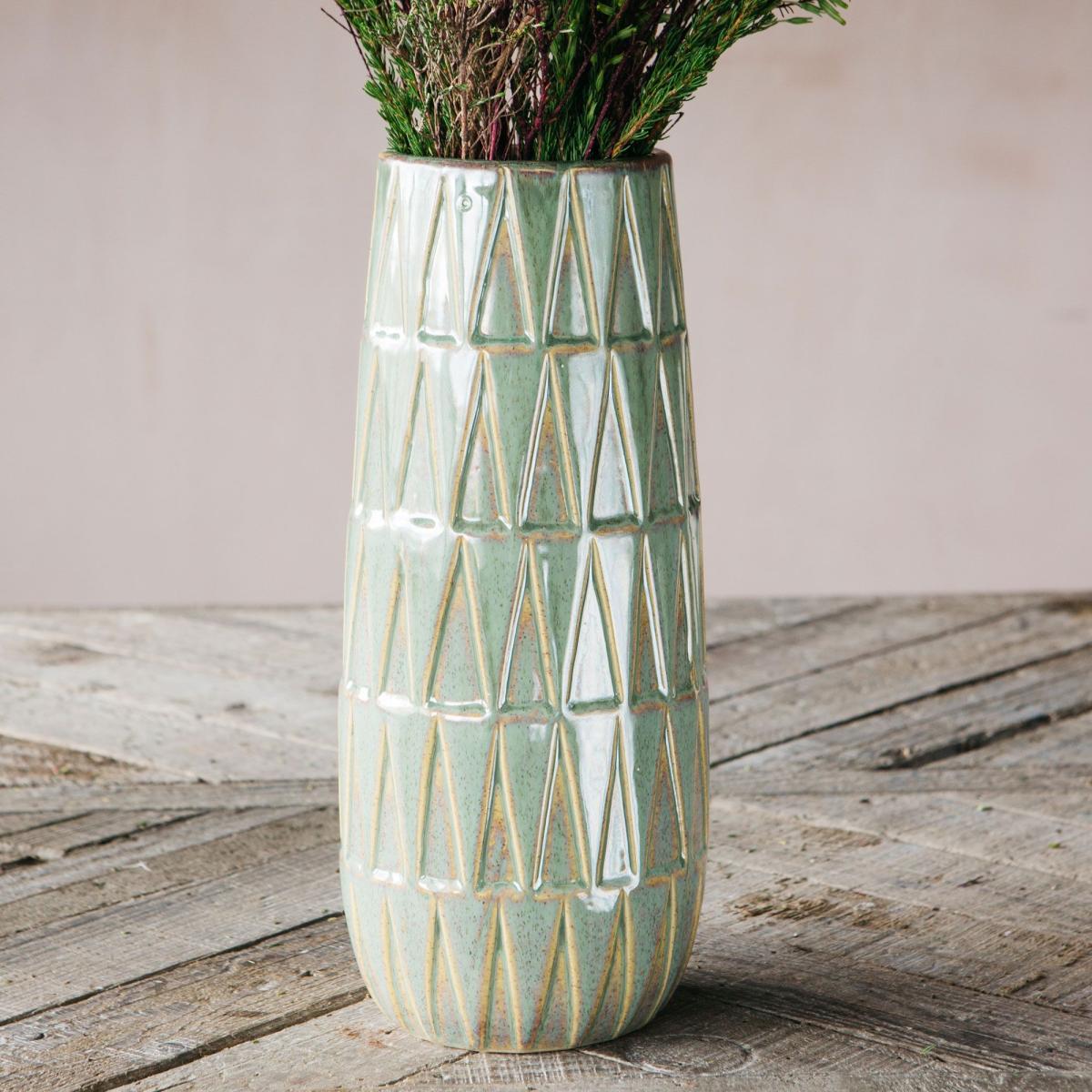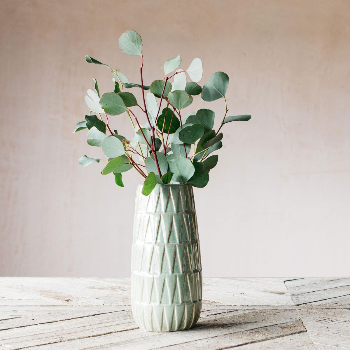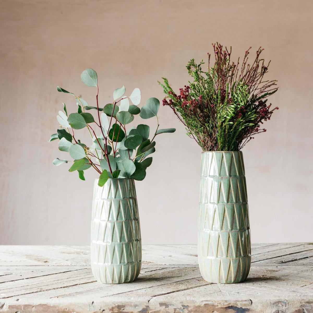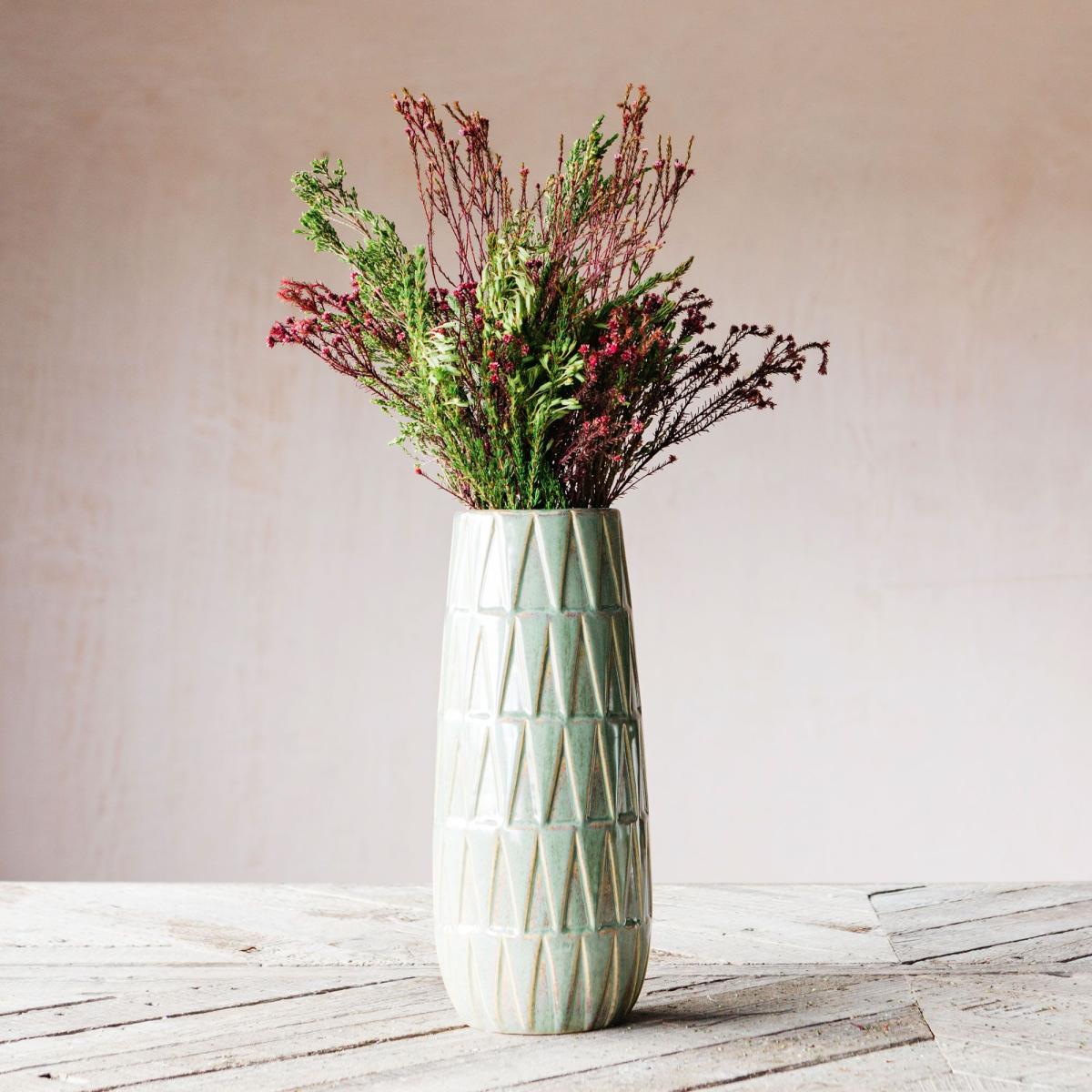 I love this mid-green glazed vase for its versatile, understated elegance. Its subtle colour and textured geometric pattern make it a great addition to both modern and vintage-inspired interiors. It works particularly well when paired with minimalist, neutral palettes, allowing the botanicals to really stand out. Practical styling tips include using it as a standalone piece on a side table or mantel, or combining it with complementary ceramics for a layered look. Its size is perfect for holding a mix of greenery or dried stems, making it a flexible choice for adding a natural touch without overwhelming the space.