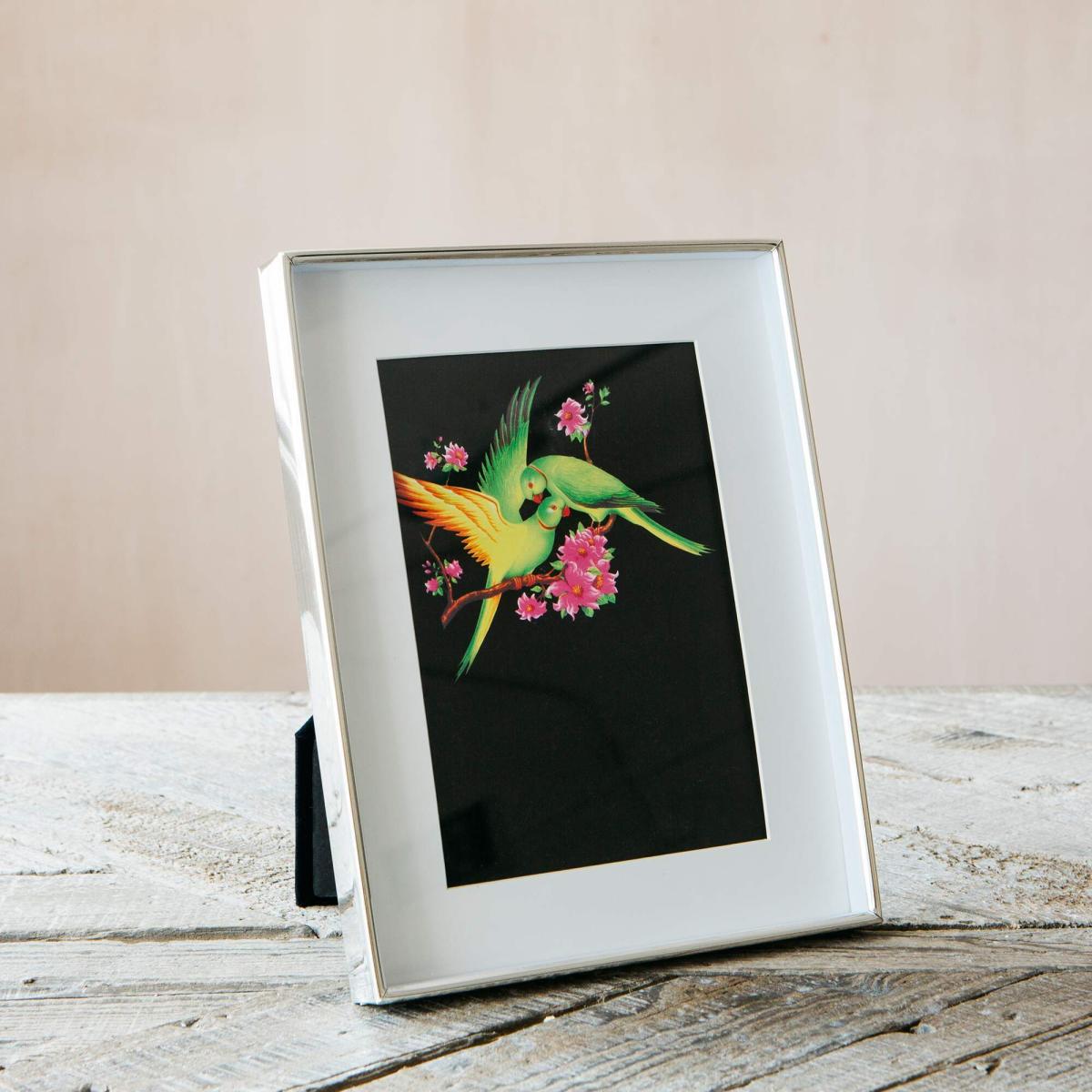 An understated rectangular photo frame featuring a slim silver border and a white mount, perfect for your favourite family portraits. H28 x W18cm. Suitable for 6. 5" x 4. 5" photographs. Made of stainless steel, glass and velvet. Not suitable for walls.