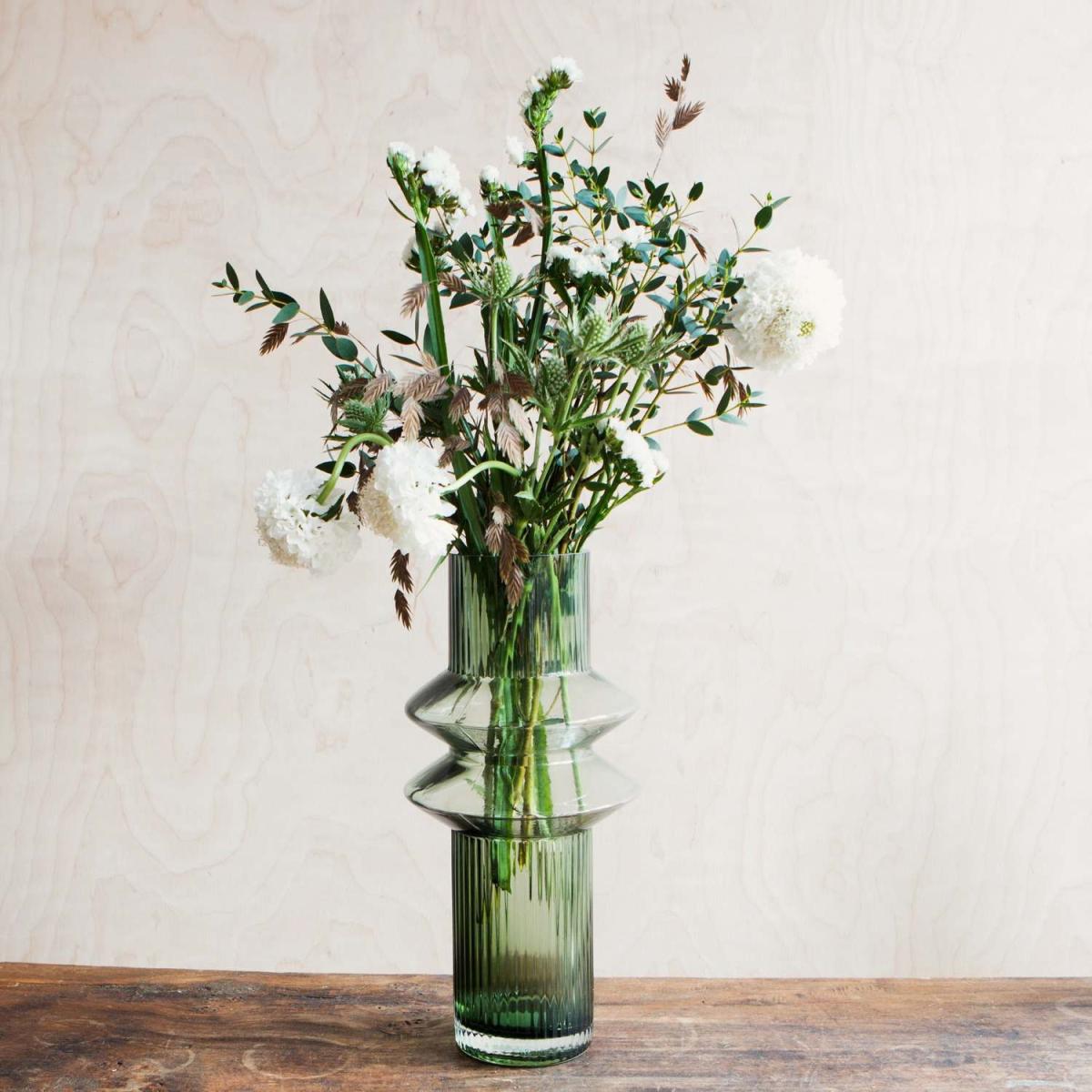 I love the Green Ribbed Vase for its subtle colour and textured design, which adds depth without overwhelming a space. It works particularly well in modern and minimalist interiors, offering a touch of colour and interest. Practical styling tips include pairing it with simple, understated blooms like green foliage or white flowers to enhance its colour, or alternatively, using it as a standalone sculptural piece in a neutral setting. Its medium size makes it versatile for side tables, mantelpieces, or dining tables, ideal for creating a relaxed, yet curated look.