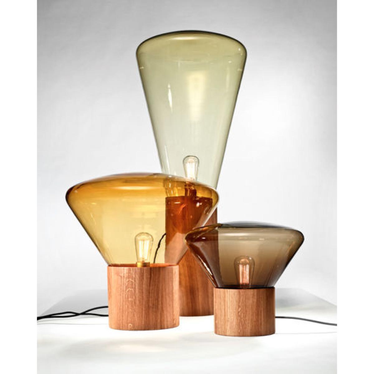 Muffins lamps are born of''the notion of combining oak and blown glass. They are produced in the European Union in Czech Republic and the design quality highlights the excellence of the materials and savoir-faire of choice producers. This series of Iamps creates a unique atmosphere through the glass'' varied tones and tints, while retaining a complete functionality. LED bulb and dimmer are included.