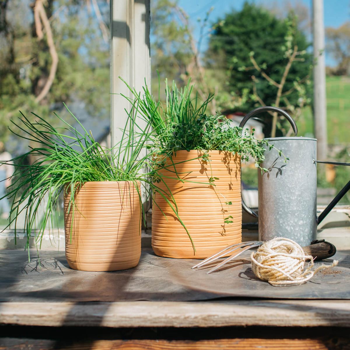 Complete your kitchen garden with fresh herbs potted in terracotta clay planters that have been handmade with a tactile ribbed pattern. Small: H15 x Diameter 15cm. Medium: H21 x Diameter 19cm. Handmade from terracotta clay. The exact colour and finish will vary. We recommend these plant pots are used indoors. If using outdoors, expect changes in colour and finish and please note extreme temperatures and rainfall may cause the plant pot to crack.