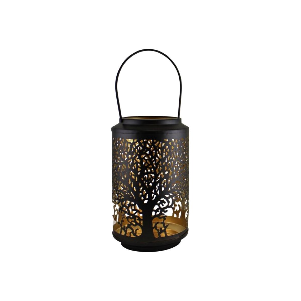 A beautiful candle lantern in black with a golden interior featuring our tree of life design cutout around the lantern. Will hold a candle of maximum size 10cm diameter and 20cm high. The lantern is made of 100 iron and features a handle for carrying or hanging.