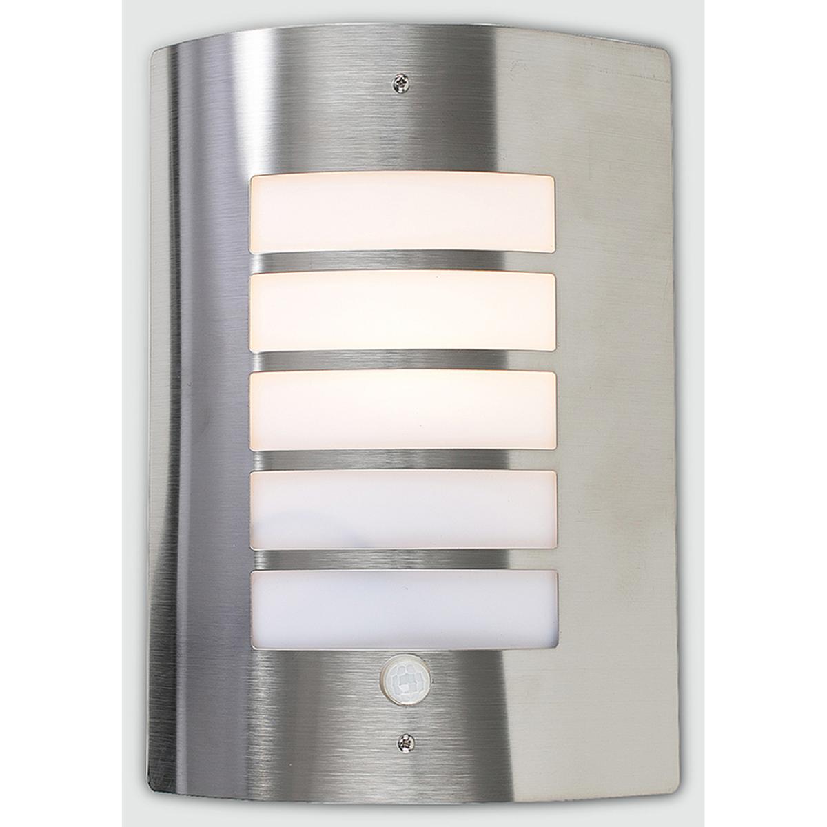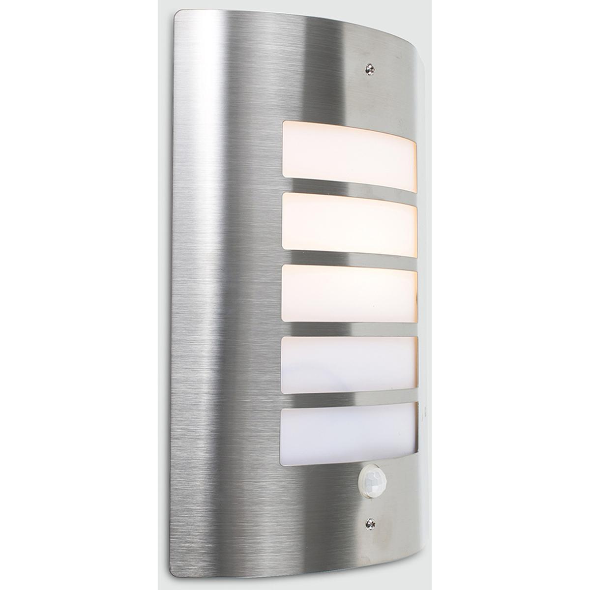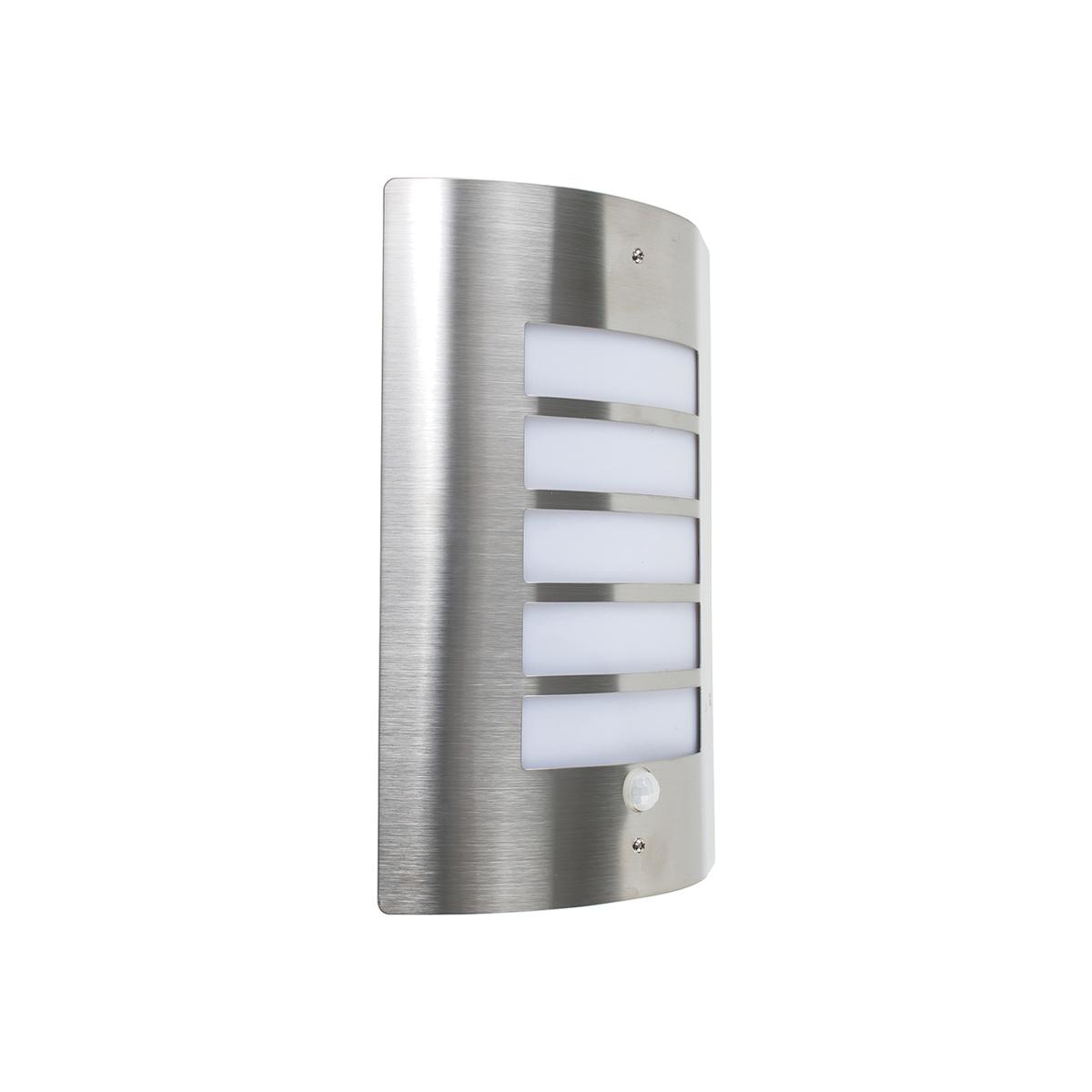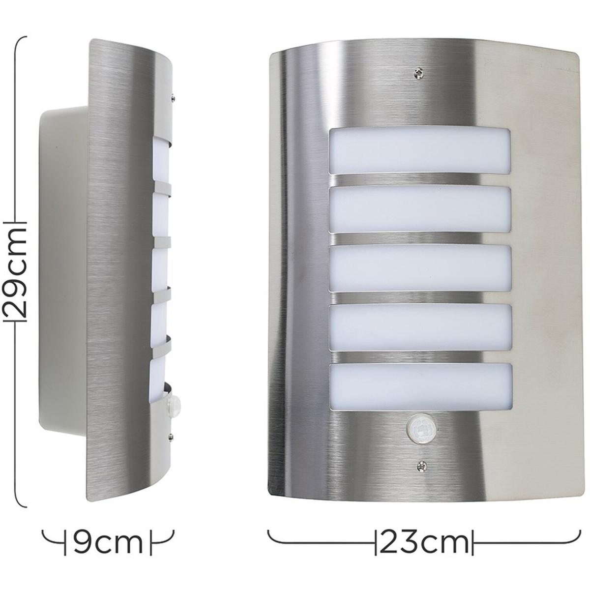 This stylish, wall mounted, outdoor light has a stunning, modern silver stainless steel flush curved design and is ideal for lighting gardens, paths, garages, patios, courtyards, decorative porches and driveways. IP44 outdoor weatherproof rated, with numerous light-emitting frosted opal lenses, providing extra security for the home and giving peace of mind. The wall-mounted outdoor flush light comes in a sturdy and weatherproof durable stainless steel design. Equipped with PIR motion detector sensor. This robust, illuminating external light is IP44 Rated and is fully certified for outdoor installation. 1 x 60w ES E27 GLS Bulb is Required - Not Supplied