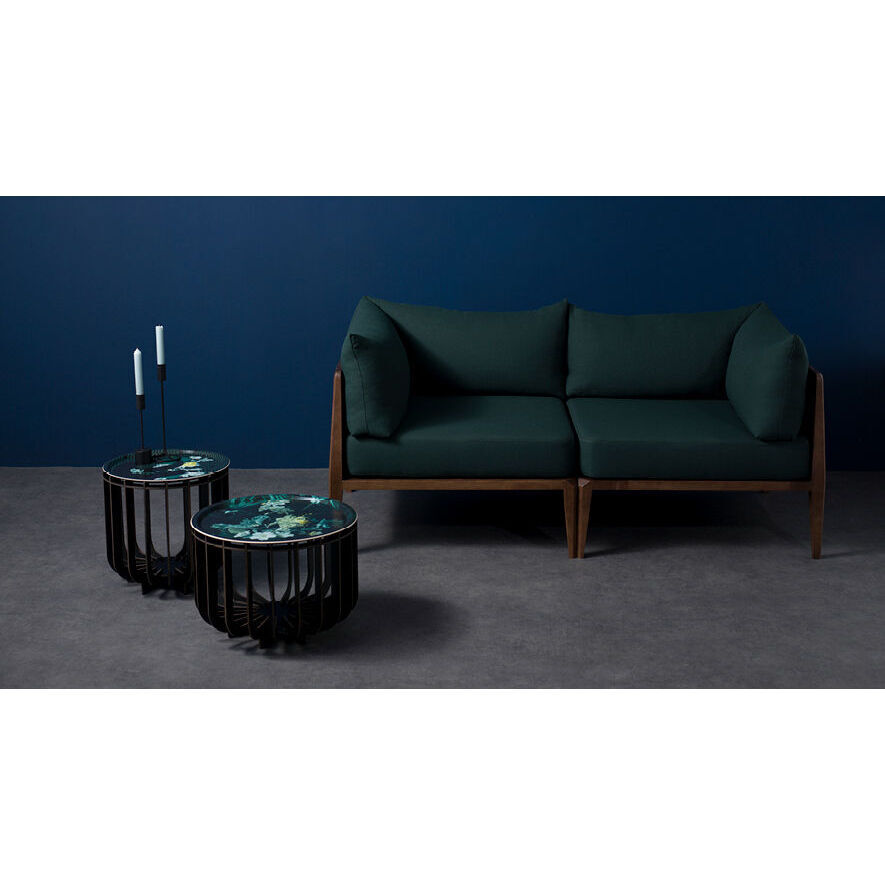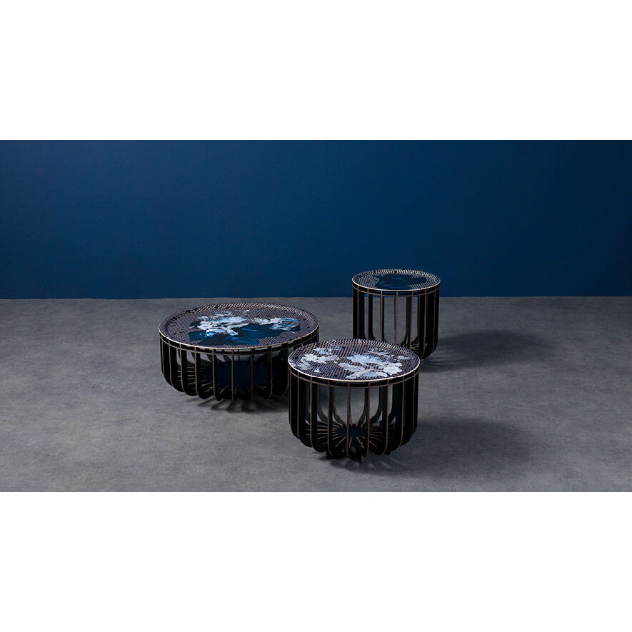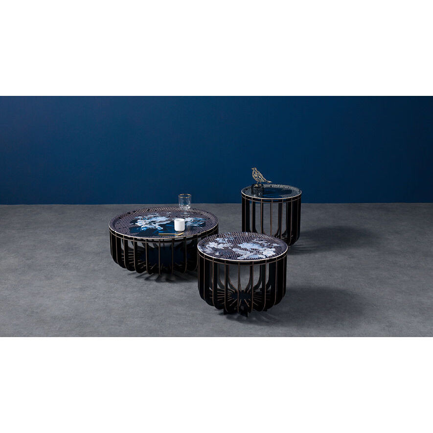 A graphic, poetic style for this elegant, compact laminate coffee table that can be used inside and out! A real painting, the top is adorned with a magnificent floral decoration. The evocative patterns invite you to daydream. Like an energetic, sensitive palette mixing flowers and painting, the Sapphire and Emerald tops are poetically inserted into the liveliness of the exterior and interior landscapes. Very practical, the top is removable: so you can bring in a coffee or easily clear away your appetisers. Medusa also stands out for its superb ethereal base which plays with voids, rhythmic lines and solid surfaces. With its sinusoidal lines cut like louvres, the base recalls the full light of summer in a subtle play of shadows. The focal point of a sun-drenched terrace, the Medusa coffee table can withstand both the test of time and everything the weather can throw at it. It creates a personal, quirky atmosphere, full of fantasy. The multifunctional Medusa can be used as a coffee table, end table, bedside table and even storage: you can store magazines or wooden logs inside. Medusa tables are available in three sizes and two colourful harmonies: Emerald and Sapphire. You can change the look of your table in the blink of an eye thanks to the removable Vibration tops sold separately.