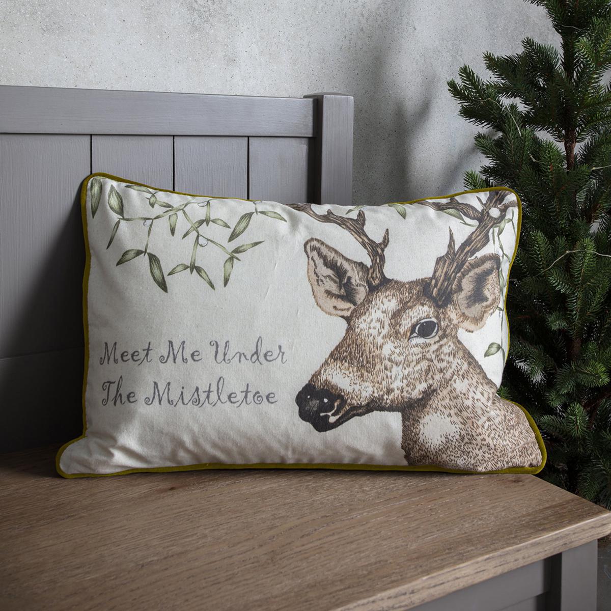 Available exclusively online, this charming cushion features a stag and mistletoe design and is completed with the “meet me under the mistletoe” motto. This cushion is perfect for bringing a touch of seasonal cheer to your home and is crafted in a warm natural colourway to complement a variety of decors. Completed with sophisticated piped edging, the removable cover is machine washable for convenient care. This rectangular cushion is ideal to support the back and waist while relaxing in your home and is feather filled for added luxury. Please note, unfortunately we cannot deliver this item to the Channel Islands.