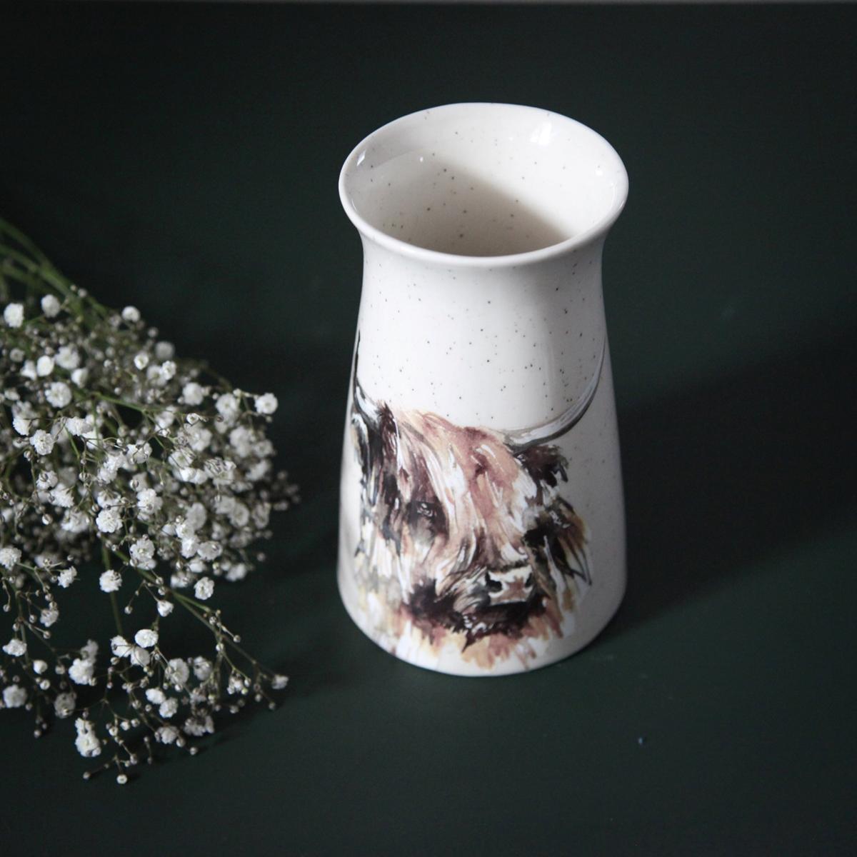 * Highland Cow Design* Made from Ceramic* Smooth Gloss Finish* Wide Opening This delightful and unique vase makes a desirable addition to both traditional and modern homes. This piece showcases white, speckled ceramic, complete with gloss finish and a beautiful highland cow image from Meg Hawkins. Its wide opening provides ample space in which to present beautiful flower displays.