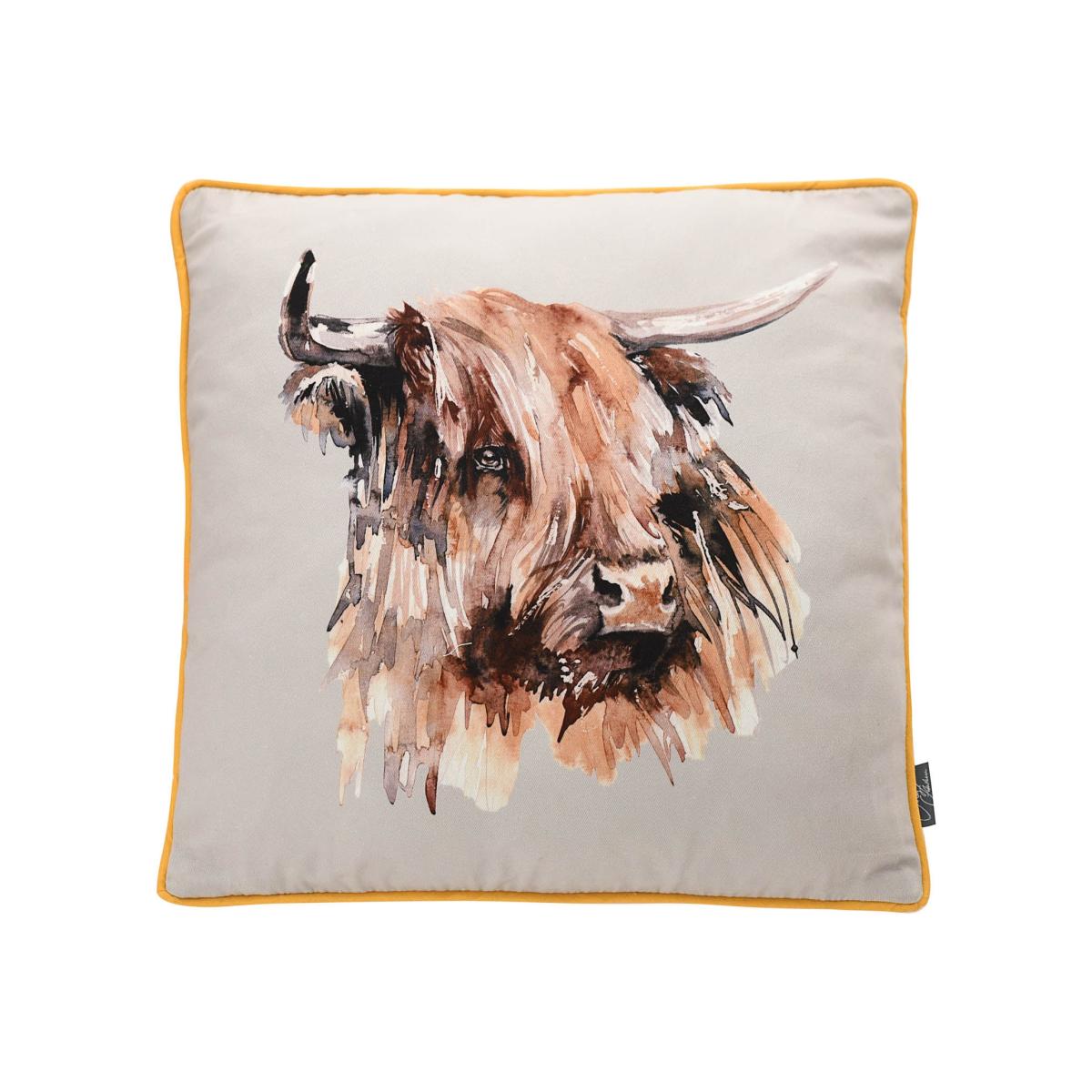 * Printed square cushion* Watercolour illustration* Eye-catching highland cow design* Zipper closure* Matching doorstop available Bring character and personality to your home with this delightfully decorative and statement cushion from the Meg Hawkins stylish homeware collection. Featuring a unique and eye catching highland cow illustration in a watercolour style, this doorstop adds a welcoming touch to your home as well as a contemporary grey background and contrast piping to uplift your home décor.