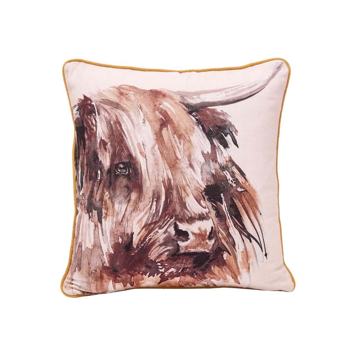 Meg Hawkins Highland Cow Square Cushion with Wooden Buttons Cream