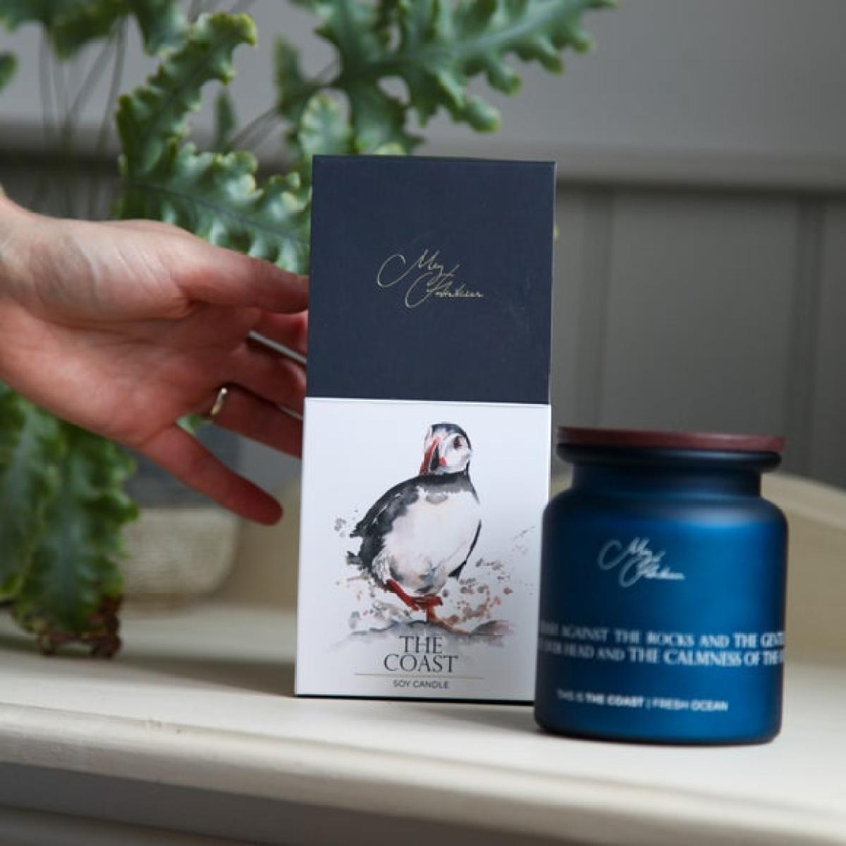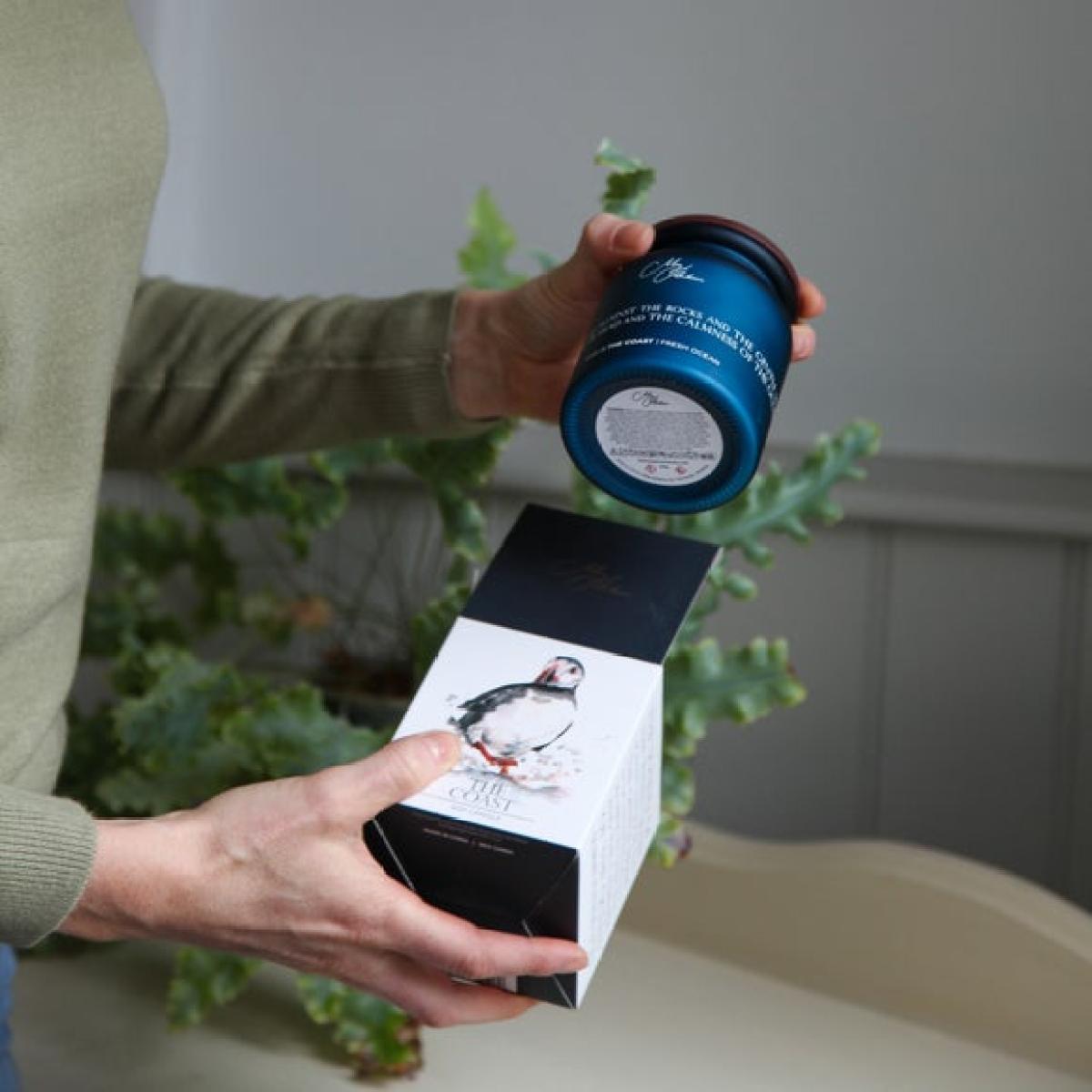 * Meg Hawkins’ puffin artwork * Fresh, ocean-inspired scent * Soy wax glass candle * 40+ hours burn time Bring the refreshing essence of the seaside into your home with The Coast Soy Candle, blending calming ocean notes for a relaxed atmosphere. Presented in a sleek glass vessel and gift box adorned with Meg Hawkins’ charming puffin design, it’s as decorative as it is fragrant. Made from premium soy wax, it delivers a clean, even burn for long-lasting enjoyment. Perfect for gifting or adding a touch of coastal calm to any space, this candle is a beautiful way to celebrate seaside living.