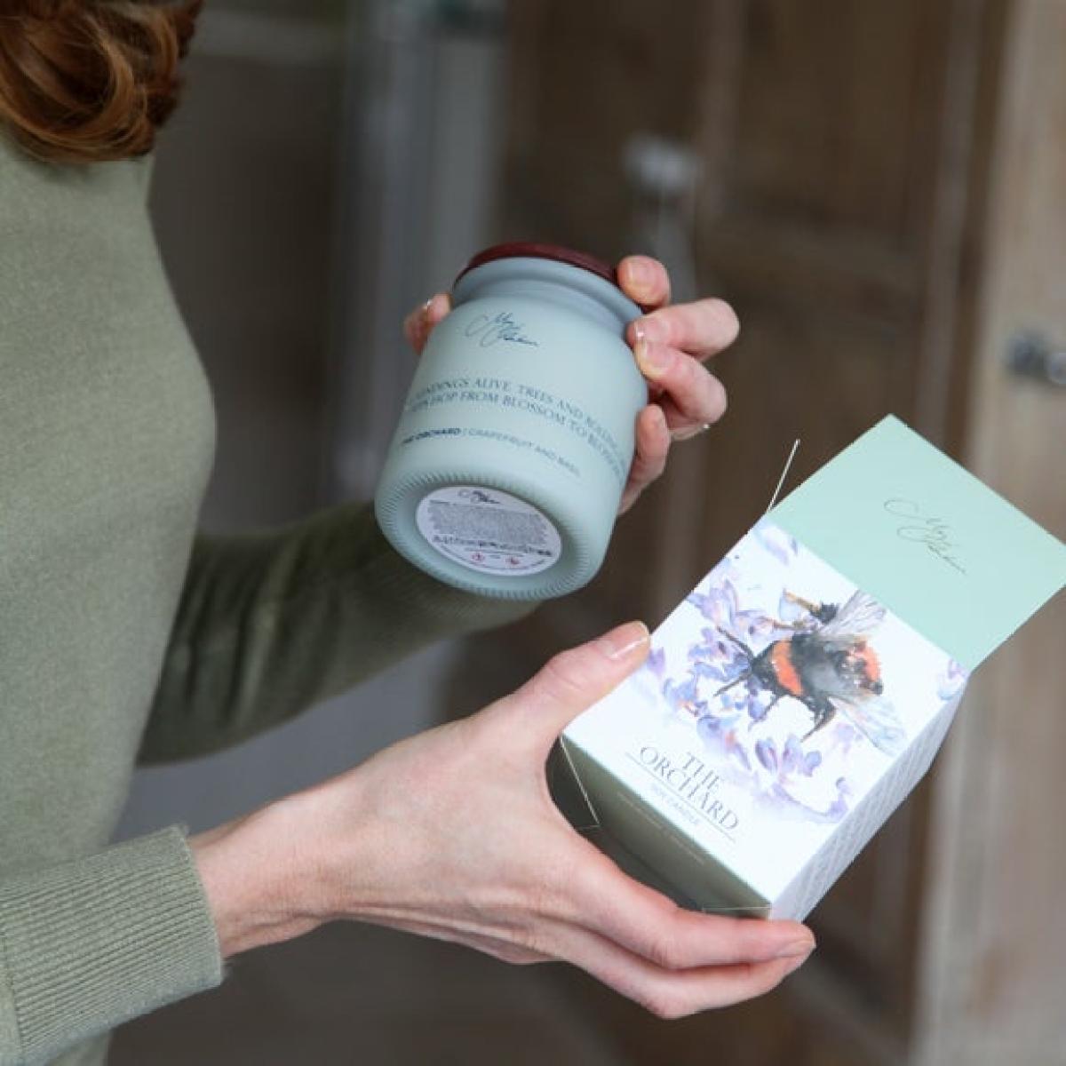 * Meg Hawkins’ Bee on Heather artwork * Grapefruit & Basil scent * 40+ hour burn time * Soy wax glass candle Bring the freshness of the outdoors in with The Orchard Soy Candle, blending bright grapefruit with aromatic basil for a revitalising lift. Presented in a simple glass vessel, it’s finished with Meg Hawkins’ cheerful Bee on Heather artwork on the box for a nature-inspired touch. With around 40+ hours of burn time, it sets a welcoming mood from busy mornings to cosy evenings.