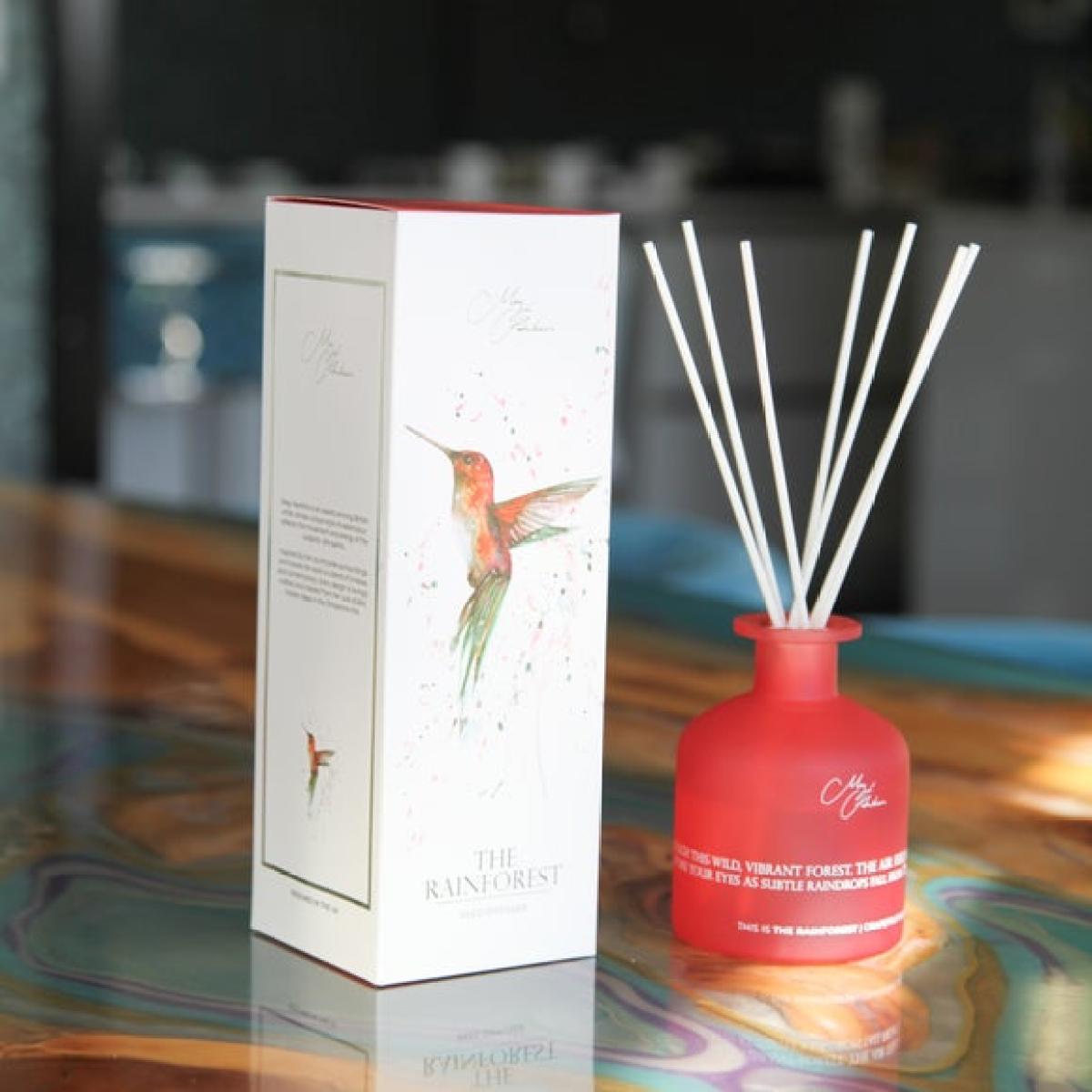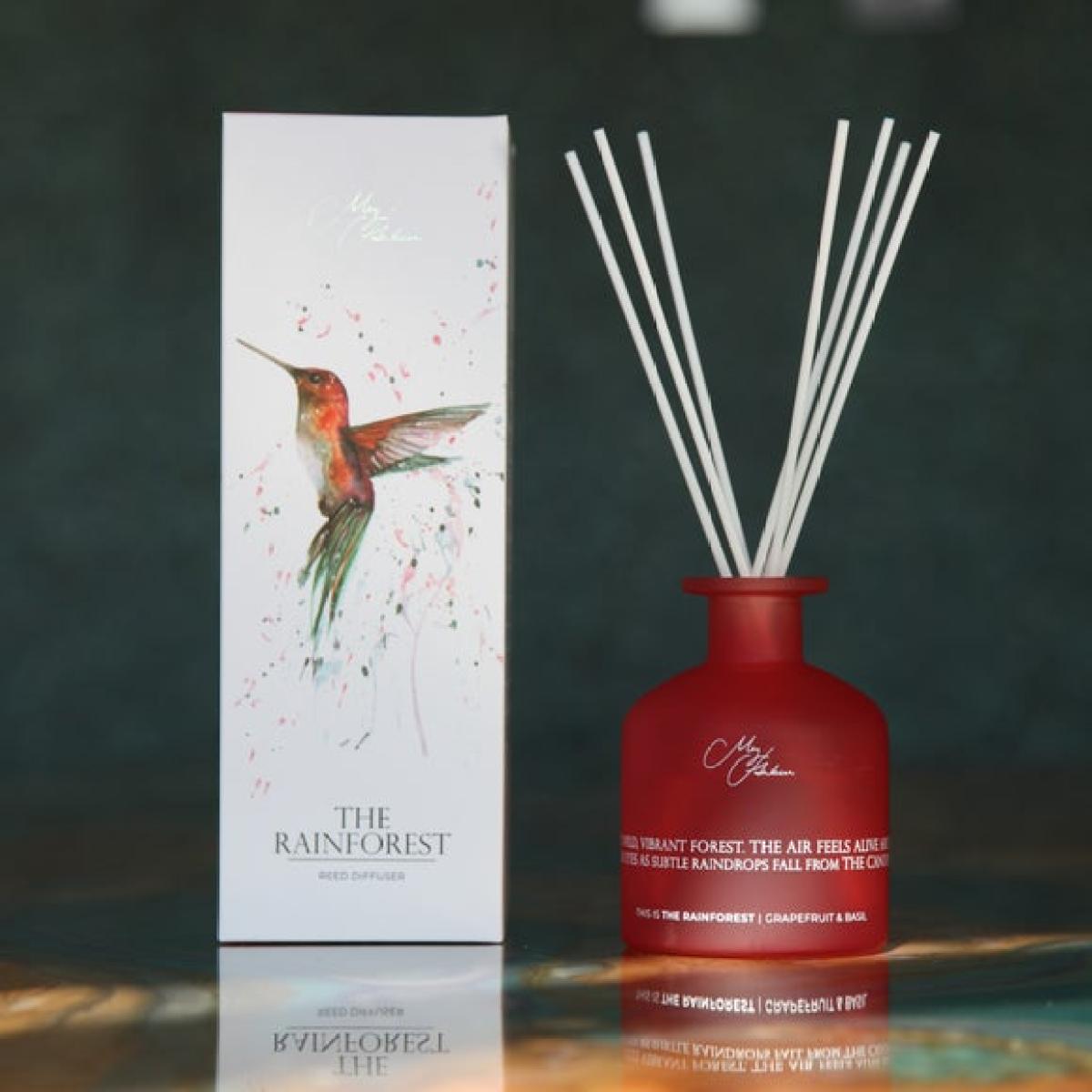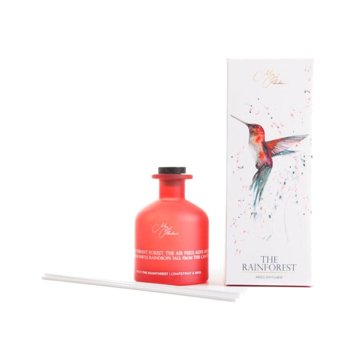 * Meg Hawkins’ hummingbird artwork * Grapefruit & Basil scent * 150ml glass diffuser * Long-lasting fragrance oil Add a lively, tropical touch to your home with The Rainforest Diffuser, blending bright grapefruit and aromatic basil for an uplifting scent. Presented in a sleek glass vessel with Meg Hawkins’ striking hummingbird artwork on the box, it’s a decorative piece as well as a home fragrance. The long-lasting fragrance oil ensures a steady, energising aroma throughout the day. Perfect for living spaces, bedrooms or hallways, it brings colour and freshness to any setting.