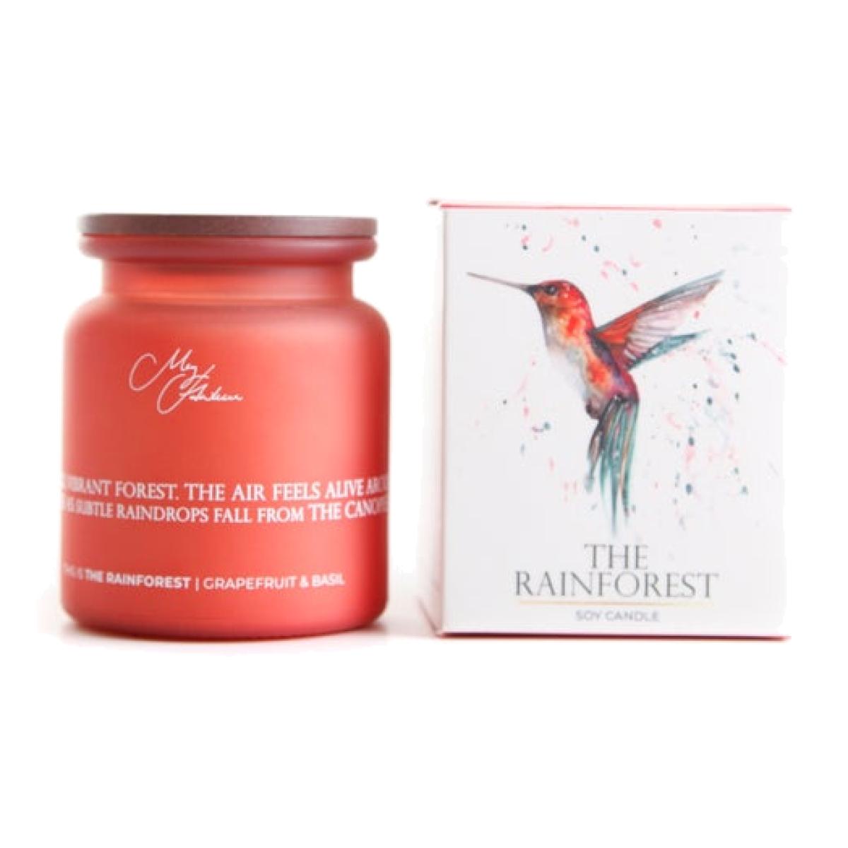* Fresh Grapefruit & Basil scent * Meg Hawkins’ hummingbird artwork * 40+ hours burn time * Soy wax glass candle Bring a burst of tropical energy to your home with The Rainforest Soy Candle, blending bright grapefruit with green basil for an uplifting scent. Housed in a simple glass vessel, it’s finished with Meg Hawkins’ vibrant hummingbird watercolour artwork for a colourful statement. With around 40+ hours of burn time, it sets the mood for lively days and cosy evenings alike.