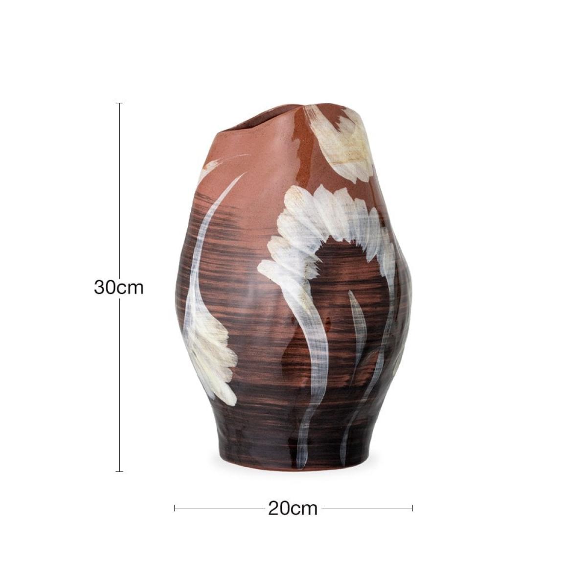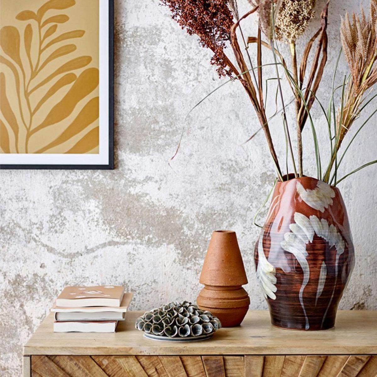 I love this chunky, earthy vase because it brings a touch of organic warmth to any space. Its rich brown tone makes it perfect for neutral or textured interiors, such as rustic, boho, or modern minimalist settings. It works particularly well when styled with dried botanicals, twigs, or minimal fresh florals to enhance its natural look. Practical styling tips include placing it on a coffee table or sideboard as a standalone piece or combining it with other textured ceramics for an eclectic display. Its substantial shape can anchor a vignette, creating a cosy yet sophisticated vibe.