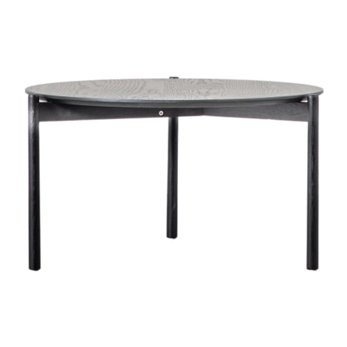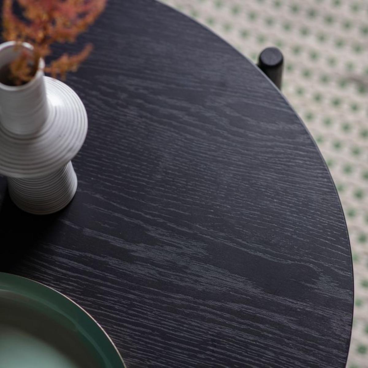 Stylish black coffee table offering a simple yet stunning design. The circular top is crafted from oak veneer, with a contemporary black finish which shows the grain of the wood. It sits on the solid oak base, which again has a black finish to match, with the ends of elegant round legs showing to echo the shape of the top. The collection is part of our Packed-Flat Design Project, offering easy delivery to any room in any property, whilst reducing the packaging needed. Easy assembly is required, but all the tools needed are supplied.