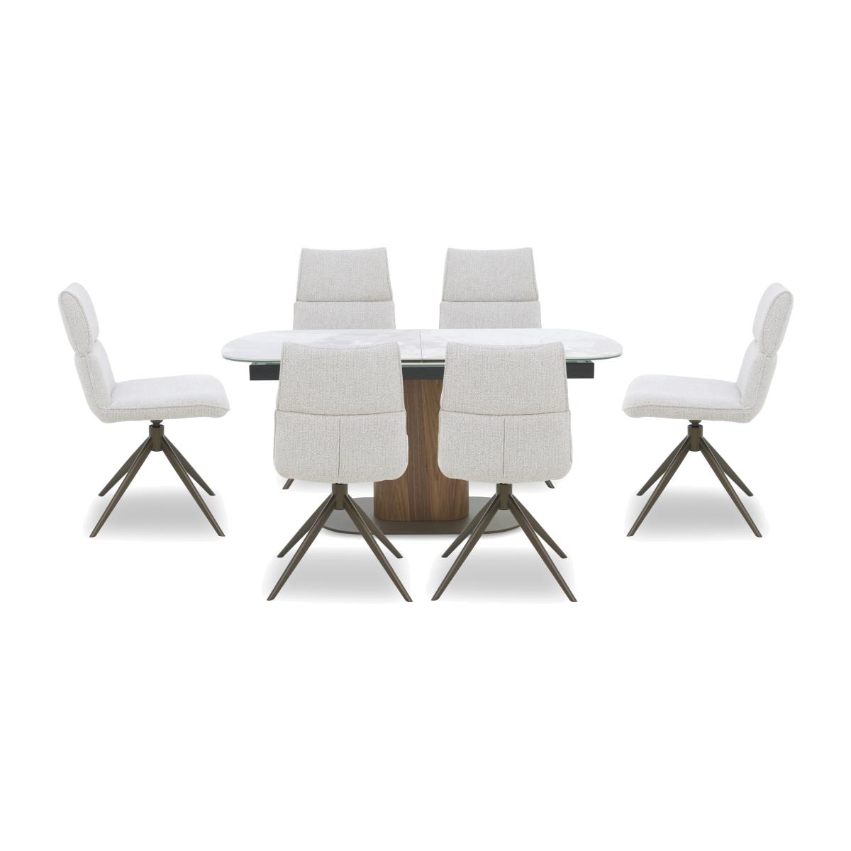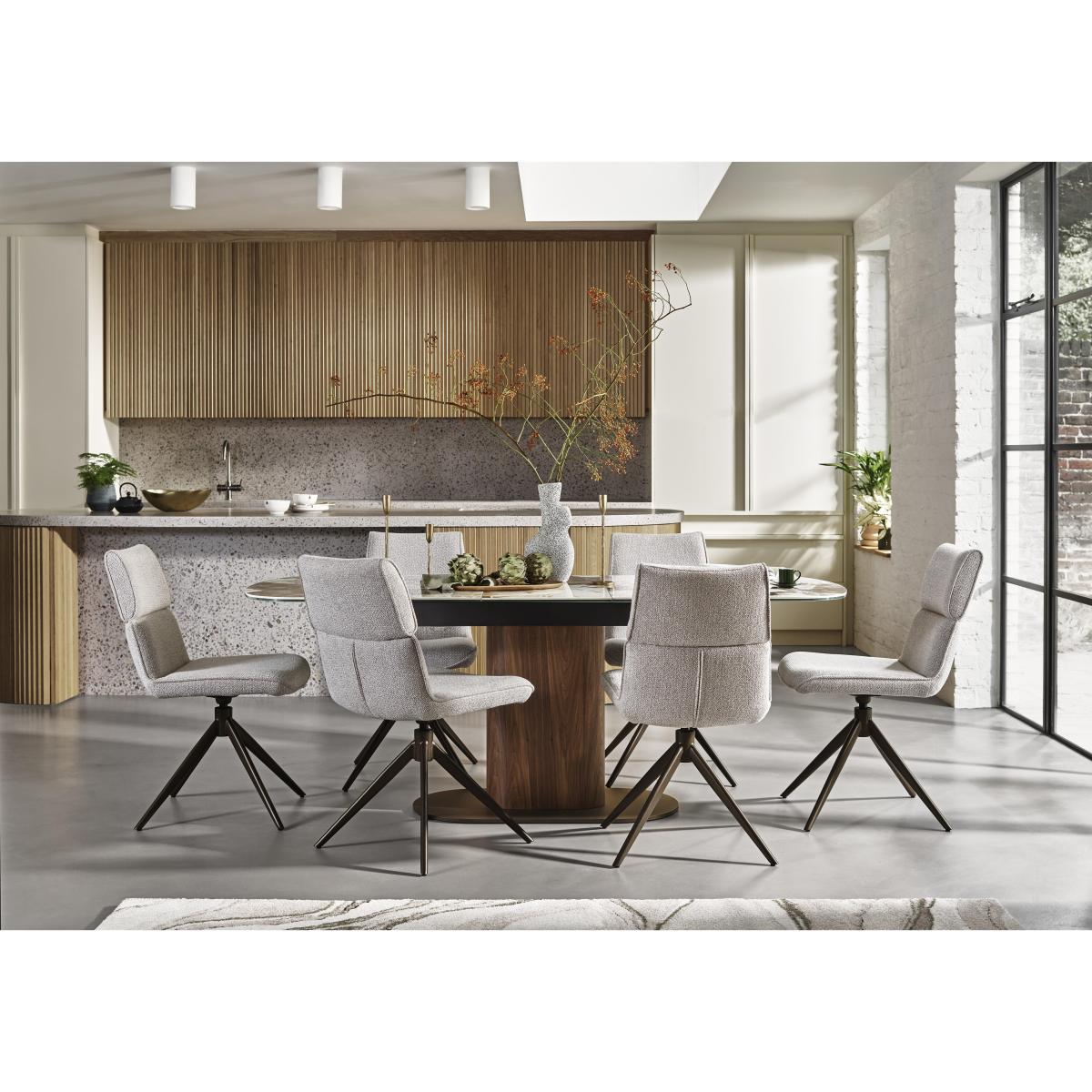 Layering tone and texture alongside meticulous details, our exclusive Mekong ceramic dining set is a stunning example of modern design at a surprisingly affordable price. Why you'll love it Fabulous modern designer style at a price everyone will love. A melding of textures and materials in a warm caramel and bronze colour palette. The extending dining table’s ceramic top has beautiful feathered patterning. Sleek and elegant proportions with rounded table top ends. Hand-applied wood veneer pedestal base is set on a slender bronze-effect plinth. The ceramic top is bonded to black glass for extra style – and extra durability. It’s also heatproof, scratch-resistant and chip-resistant. Quick and easy pop-up extension mechanism. The extra leaf stays stored when not in use. Table available in 2 sizes. With 6 chic and contemporary swivel dining chairs. Bronze-coloured metal legs. Upholstered in a pale grey fabric. Exclusively available at Furniture Village. This dining set with extending dining table is part of our Mekong range. What you need to know 160 cm dining table seats 8 closed and 10 extended. 130 cm dining table seats 8 closed and 8 extended. We recommend using coasters and placemats at all times. Easy to care for. Simply wipe with a clean, slightly damp cloth. Item code: MEKODST2--001
