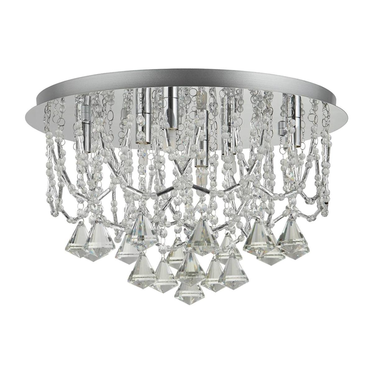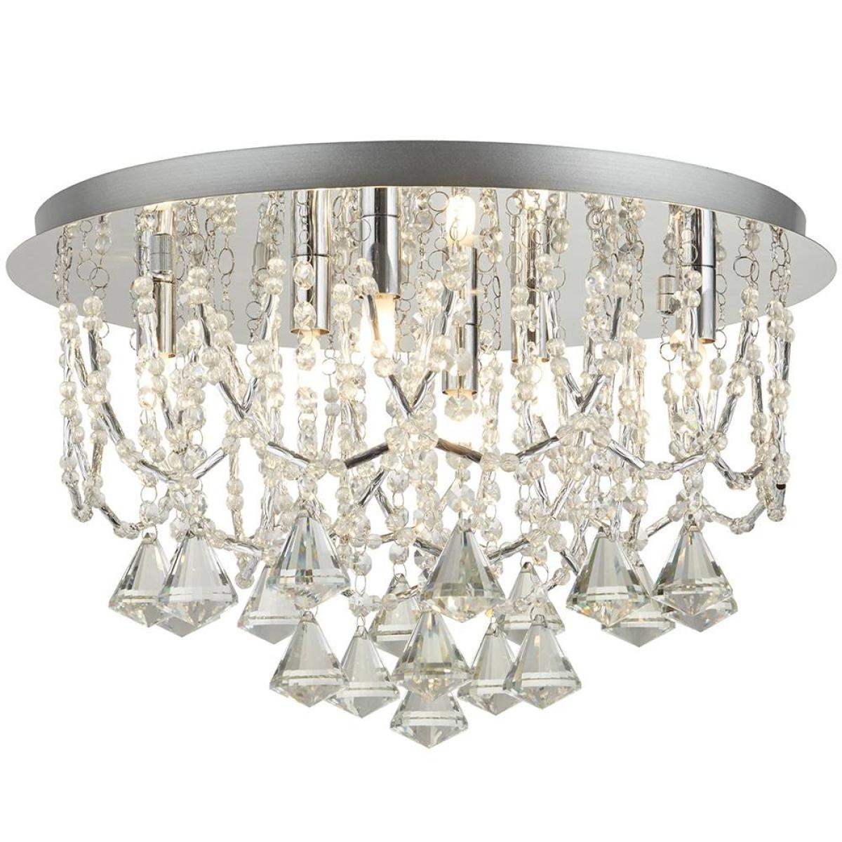 The Mela 6 Light Flush Ceiling Light is a stunning piece from Searchlight. From the polished chrome ceiling plate, a dazzling array of crystal pieces are suspended. When lit, a mesmerising effect is created as the light shines against the crystal pyramid drops and delicate crystal trim detailing. The Mela Ceiling Light is 285mm in height and 450mm in diameter. It requires 6 x G9 Capsule light bulbs with a maximum wattage of 7w. Product Code: 9986-6C. C The Mela 6 Light Flush Ceiling Light is a stunning piece from Searchlight. From the polished chrome ceiling plate, a dazzling array of crystal pieces are suspended. When lit, a mesmerising effect is created as the light shines against the crystal pyramid drops and delicate crystal trim detailing. The Mela Ceiling Light is 285mm in height and 450mm in diameter. It requires 6 x G9 Capsule light bulbs with a maximum wattage of 7w. Product Code: 9986-6C. C