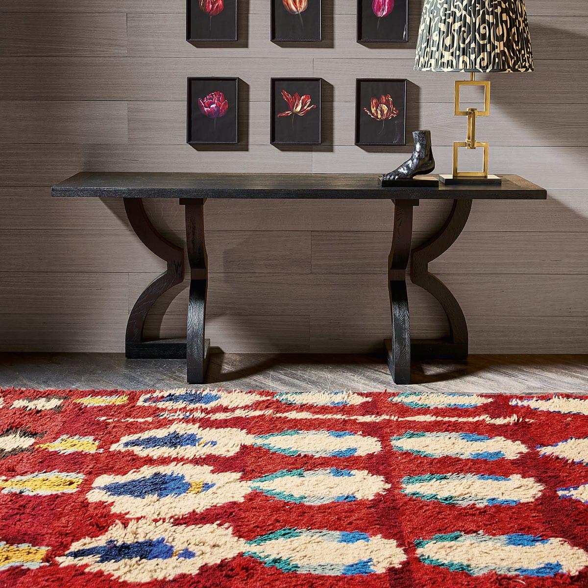 I love this rug for adding a bold statement to a range of interiors, thanks to its vibrant red hue and lively pattern. It works particularly well in neutral or minimalist spaces, providing colour and character without overwhelming the room. In more eclectic schemes, it can serve as a focal point, tying together various colours and textures. Practical styling tips include pairing it with simple furniture to let the rug stand out or layering with textured textiles for a cosy, inviting feel. Its durability makes it suitable for both living rooms and hallways, making it a versatile choice for adding warmth and personality to your space.