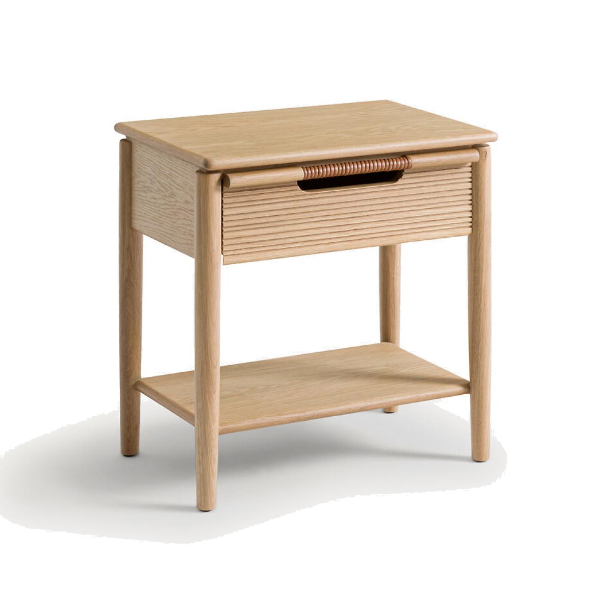FSC® Melaly oak bedside table. The simple lines of this bedside table are highlighted by a top with chamfered edges, the striated woodwork of the drawer and the leather detail of the handles. Functional, it offers storage space (a drawer, a shelf) and a particularly neat finish with its leather-wrapped handle. Product Details • Chamfered edge table top • Unit, shelf and drawer in certified FSC® mix oak veneer MDF • Base and drawer front in certified FSC® mix solid oak • Drawer front in ribbed oak • Polyurethane finish • Genuine leather wrapped handle (cowhide, corrected grain, pigmented finish, chrome tanned).Dimensions • Width: 49cm • Height: 53cm • Depth: 34cm Delivery:Sold pre-assembled. Available for home delivery. Note! Please check that all access points are large enough to accommodate your delivery (doors, stairs, lifts). • WOOD FROM MORE SUSTAINABLY MANAGED FORESTS AND CONTROLLED SOURCES. FSC® Mix wood contains at least 70% FSC® certified and/or recycled wood, the remainder being FSC® controlled wood. Parcel dimensions and weight: 1 parcel L51 x H62 x D41.5cm, 13kg