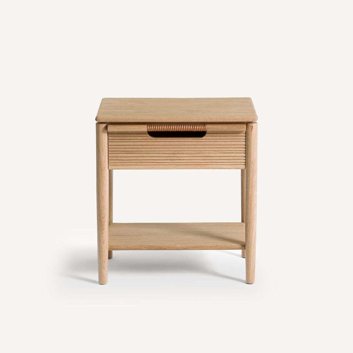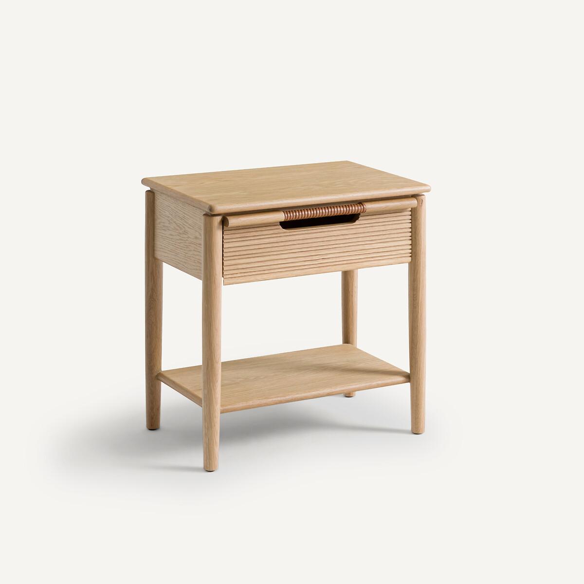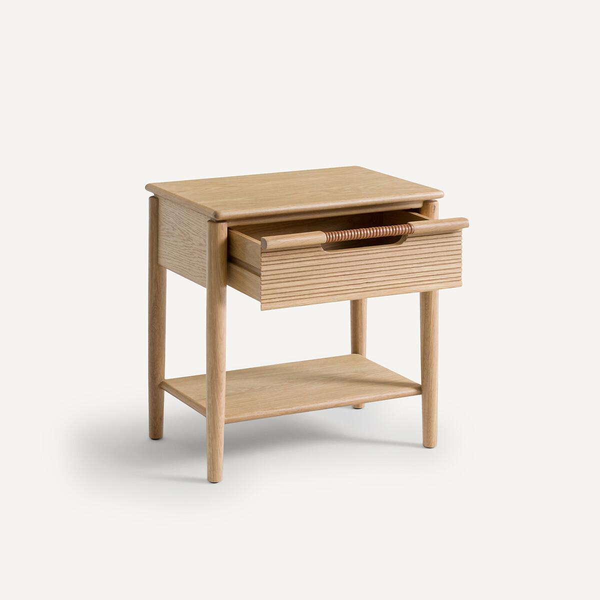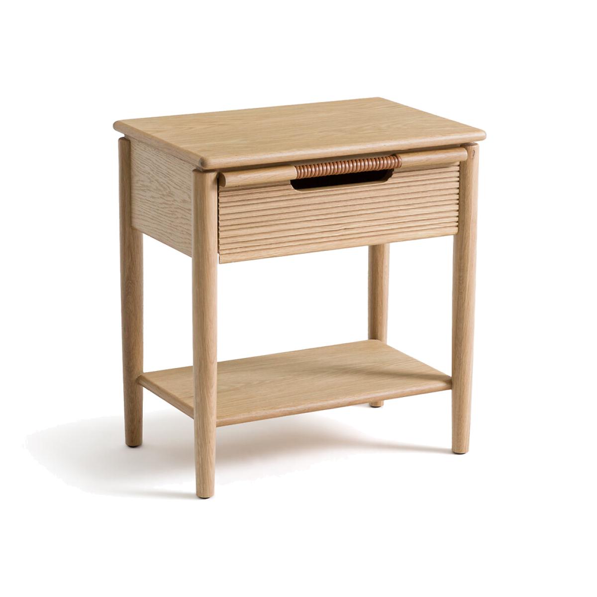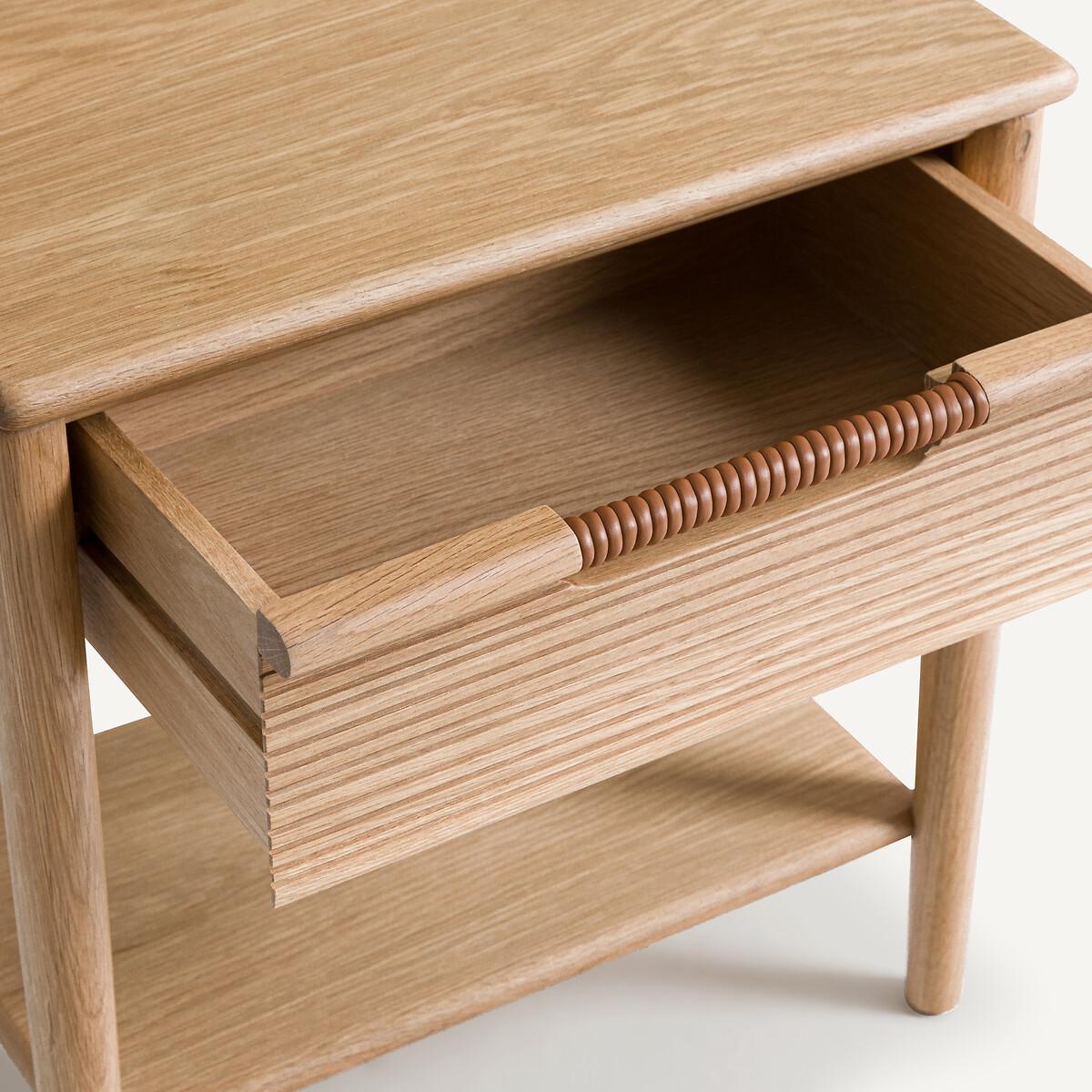 FSC® Melaly oak bedside table. The simple lines of this bedside table are highlighted by a top with chamfered edges, the striated woodwork of the drawer and the leather detail of the handles. Functional, it offers storage space (a drawer, a shelf) and a particularly neat finish with its leather-wrapped handle. Product Details • Chamfered edge table top • Unit, shelf and drawer in certified FSC® mix oak veneer MDF • Base and drawer front in certified FSC® mix solid oak • Drawer front in ribbed oak • Polyurethane finish • Genuine leather wrapped handle (cowhide, corrected grain, pigmented finish, chrome tanned).Dimensions • Width: 49cm • Height: 53cm • Depth: 34cm Delivery:Sold pre-assembled. Available for home delivery. Note! Please check that all access points are large enough to accommodate your delivery (doors, stairs, lifts). • WOOD FROM MORE SUSTAINABLY MANAGED FORESTS AND CONTROLLED SOURCES. FSC® Mix wood contains at least 70% FSC® certified and/or recycled wood, the remainder being FSC® controlled wood. Parcel dimensions and weight: 1 parcel L51 x H62 x D41.5cm, 13kg