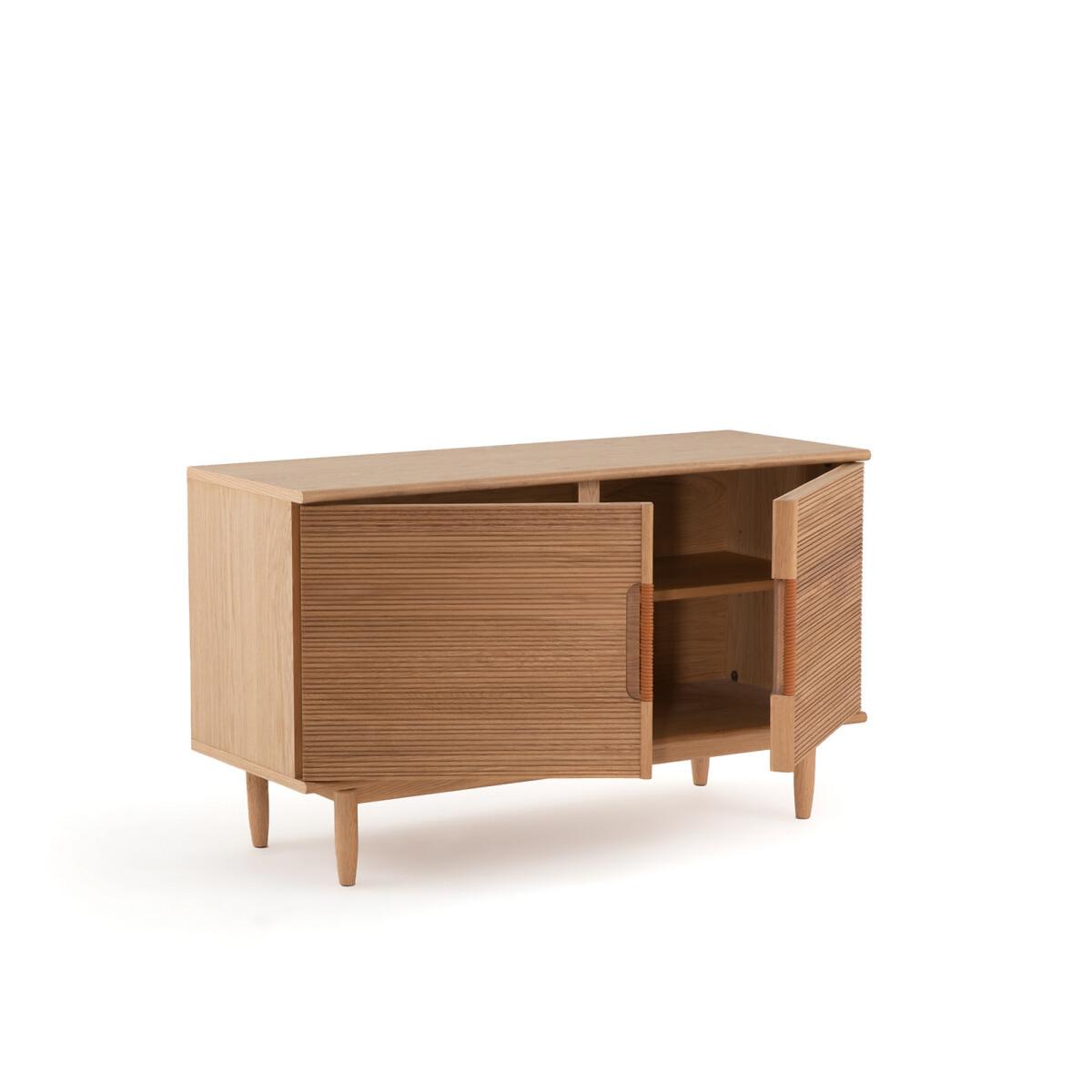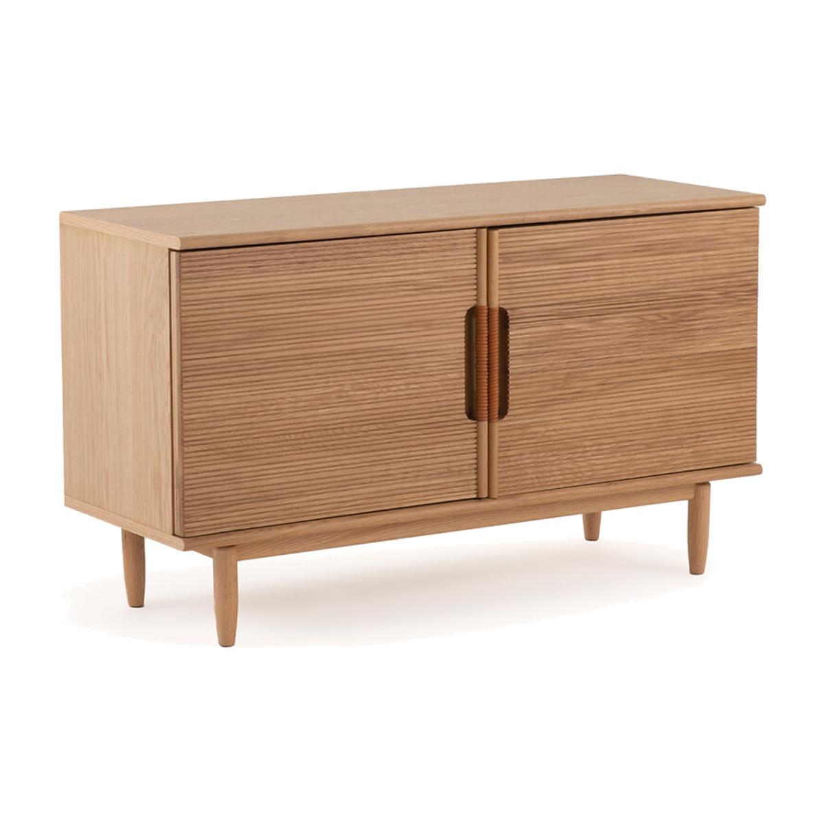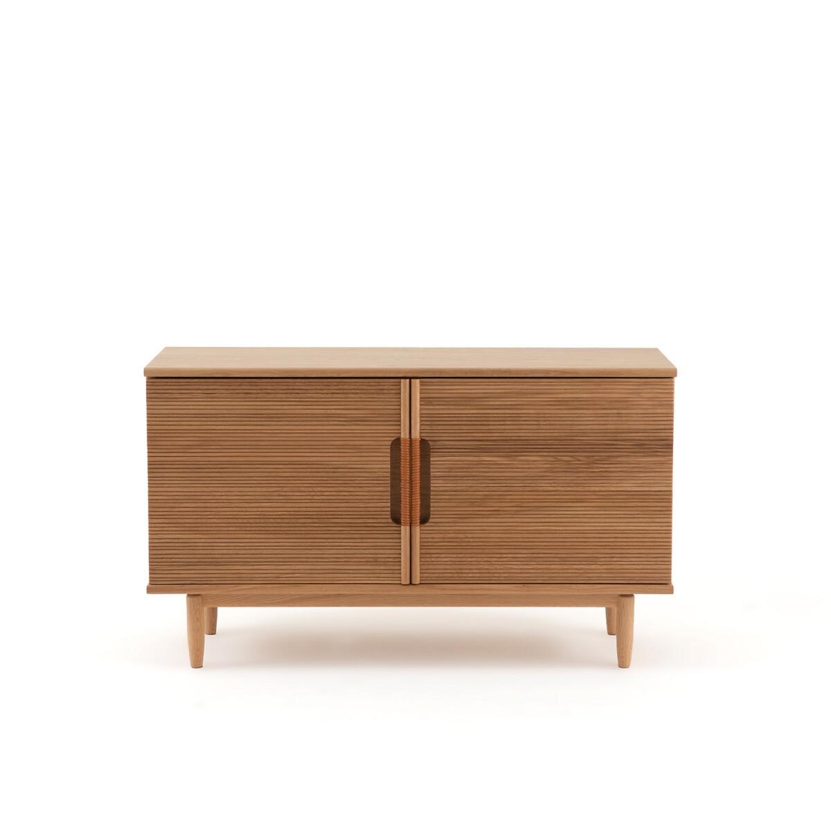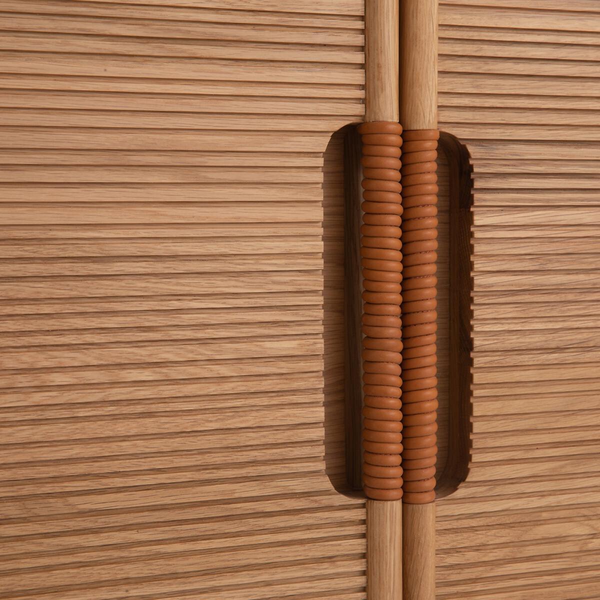 The Melaly oak sideboard. The simple lines of this sideboard are highlighted by a top with chamfered edges, the ridged woodwork of the doors and the leather detail of the handles..