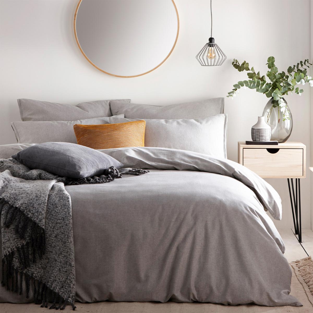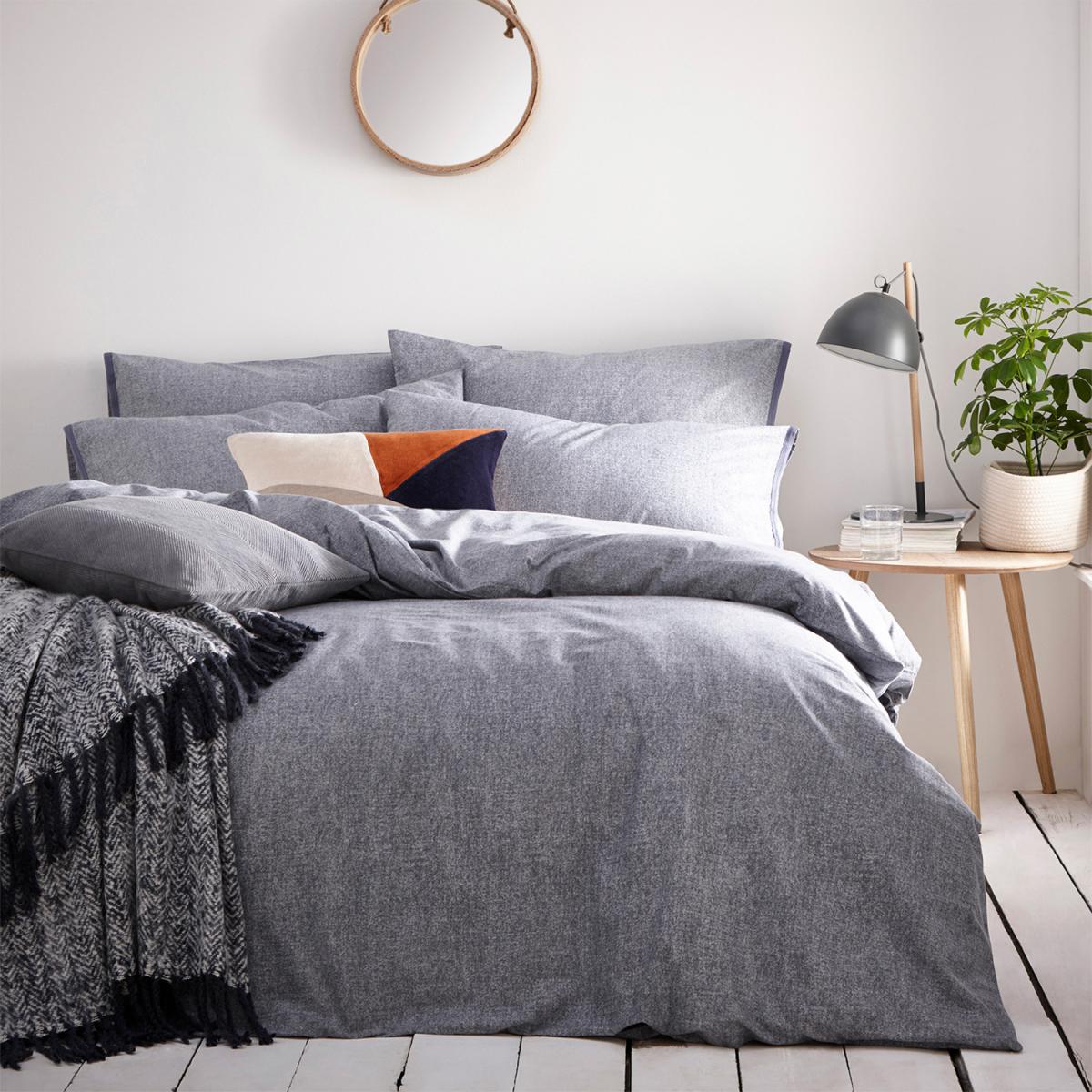 These duvet covers are a contemporary and minimalistic addition to your home. The included matching pillowcase creates a simple yet relaxed look with their herringbone ribbon trims. Featuring a subtle melange print detail to add a textured appearance, making it perfect to layer up with other colours.