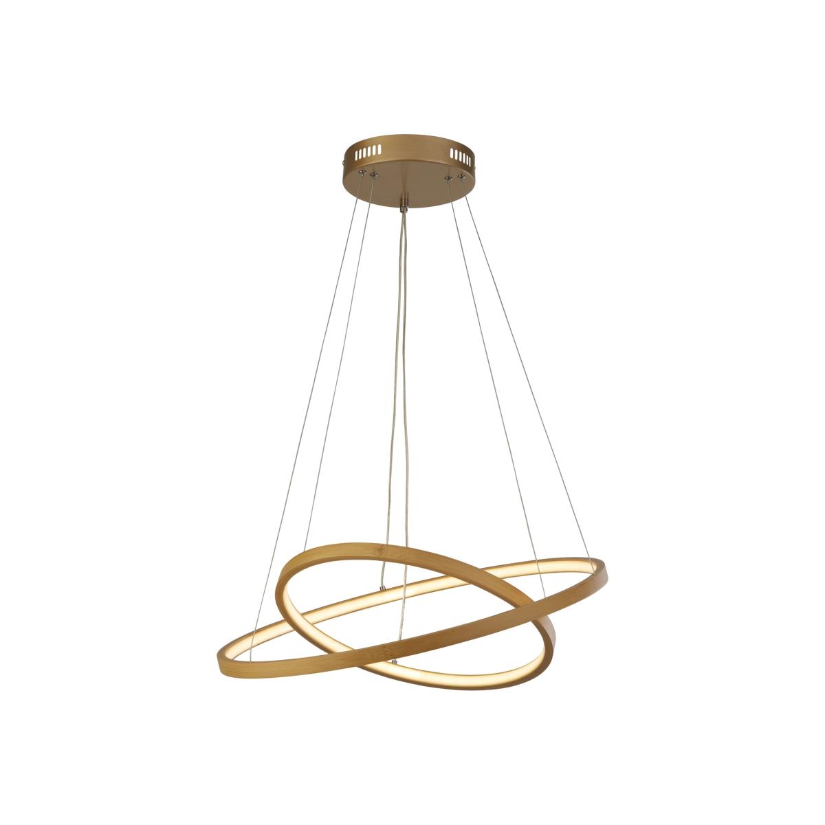 Infuse your space with a contemporary and notably natural ambiance using this bamboo-edged pendant light. At 1200mm high, its captivating double-ring and overlapping design not only adds a modern touch but also brings an eye-catching focal point to the room, combining style with the organic allure of bamboo for a unique and inviting atmosphere. Integrated LED.
