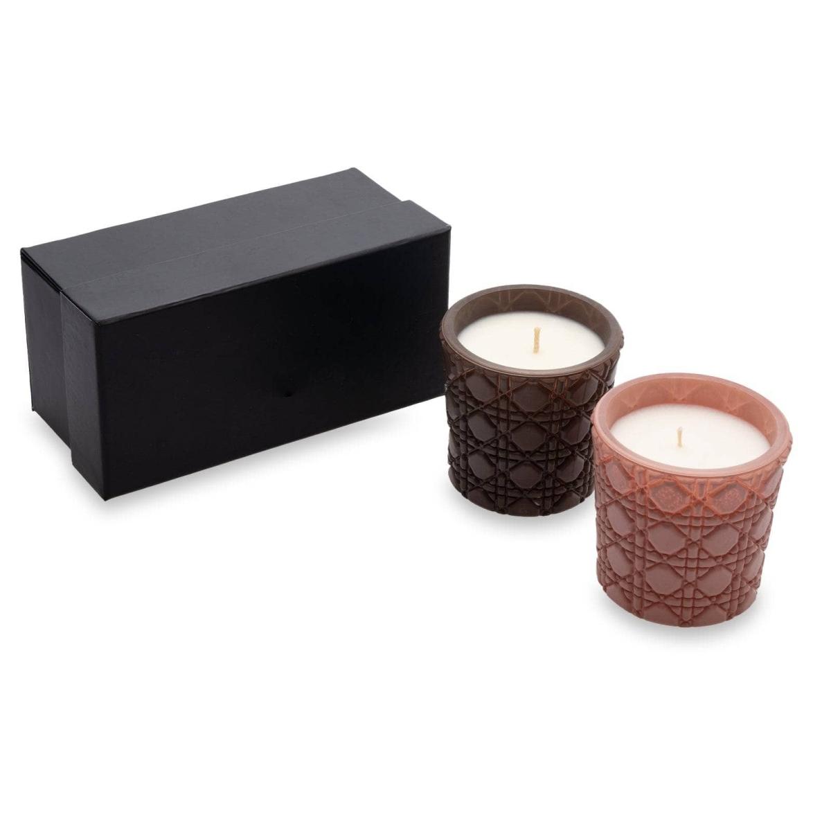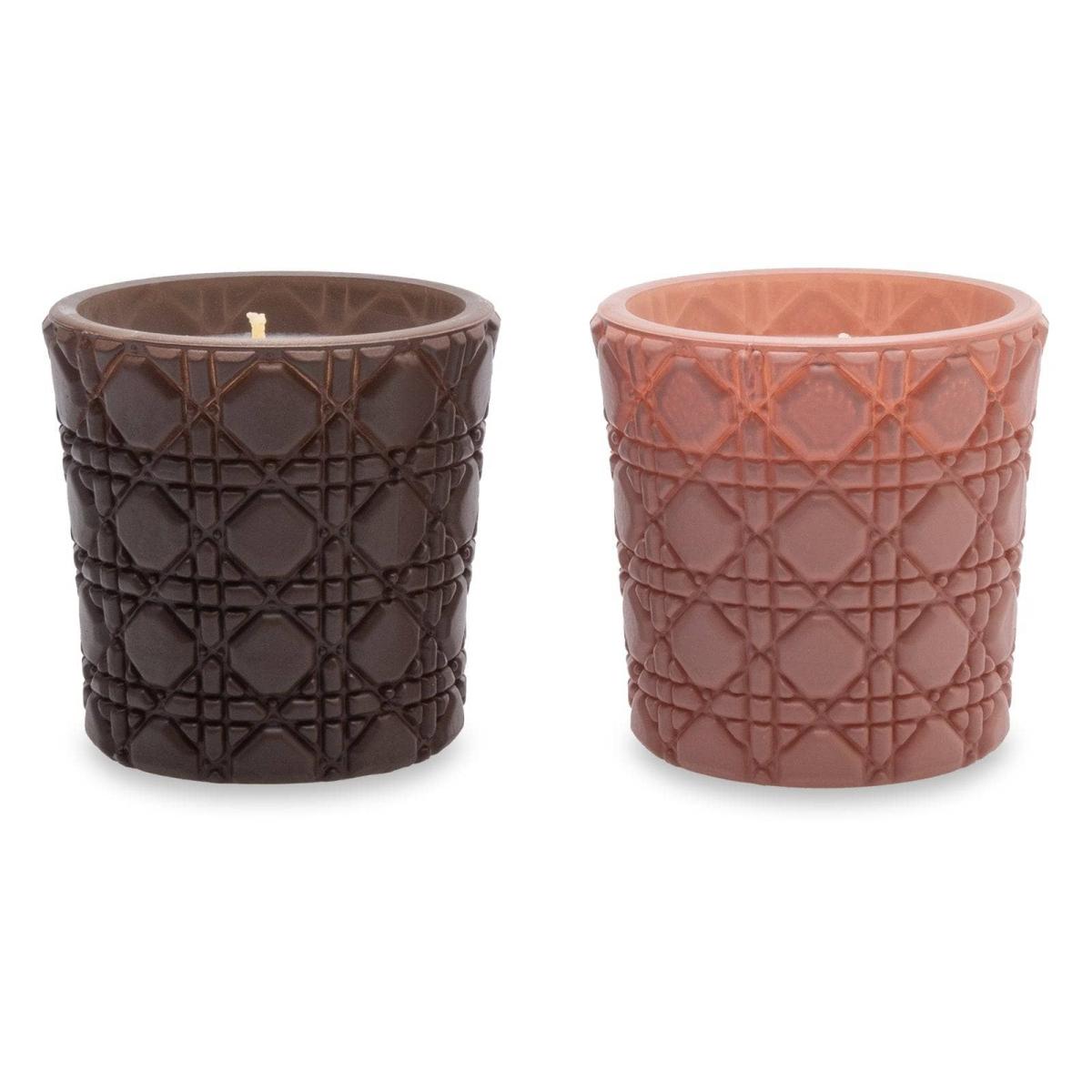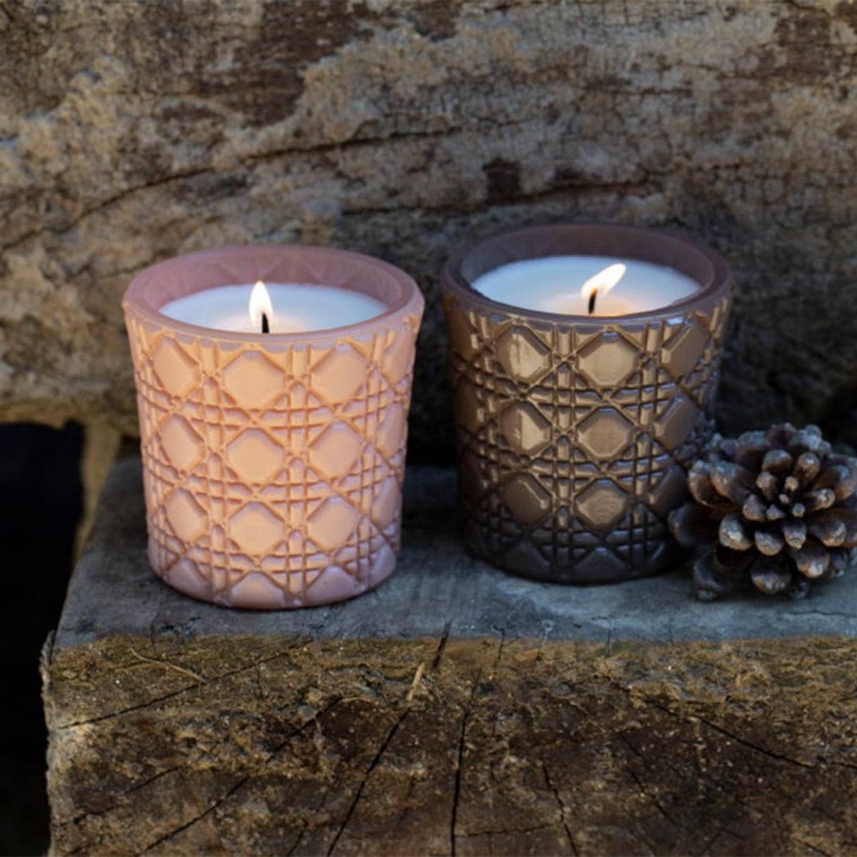 This set consists of two different scents. The Pink candle has a harmony of orange blossoms blended with the bitter aroma of honey, combined with hints of Turkish rose and muguet flower. The Taupe candle has an intense harmony of almond and black coffee on a warm base of amber, incense, and vanilla. Both in hand-crafted glass jars with lids, and made from natural soy wax.