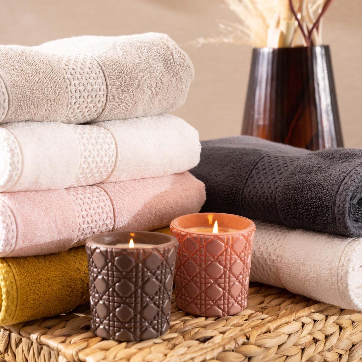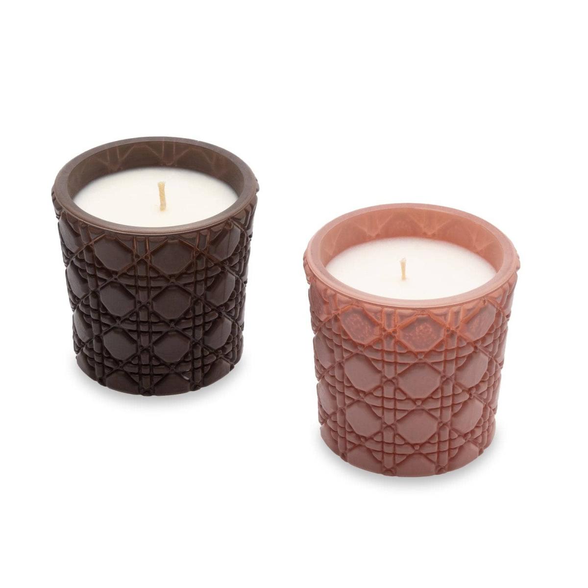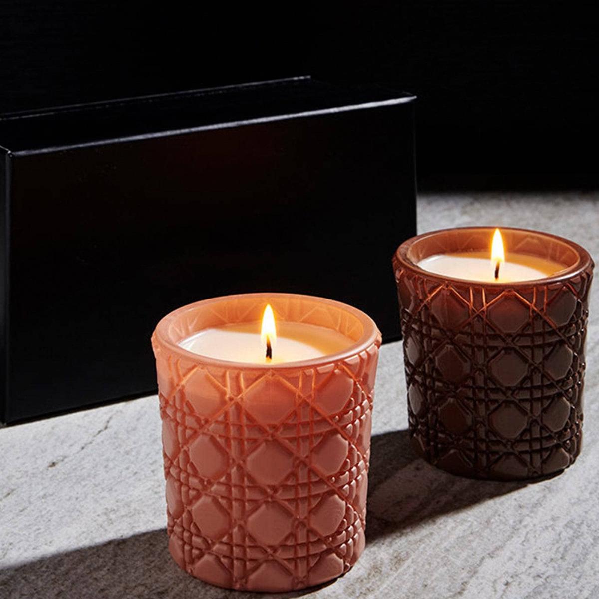 This set consists of two different scents. The Pink candle has a harmony of orange blossoms blended with the bitter aroma of honey, combined with hints of Turkish rose and muguet flower. The Taupe candle has an intense harmony of almond and black coffee on a warm base of amber, incense, and vanilla. Both in hand-crafted glass jars with lids, and made from natural soy wax.