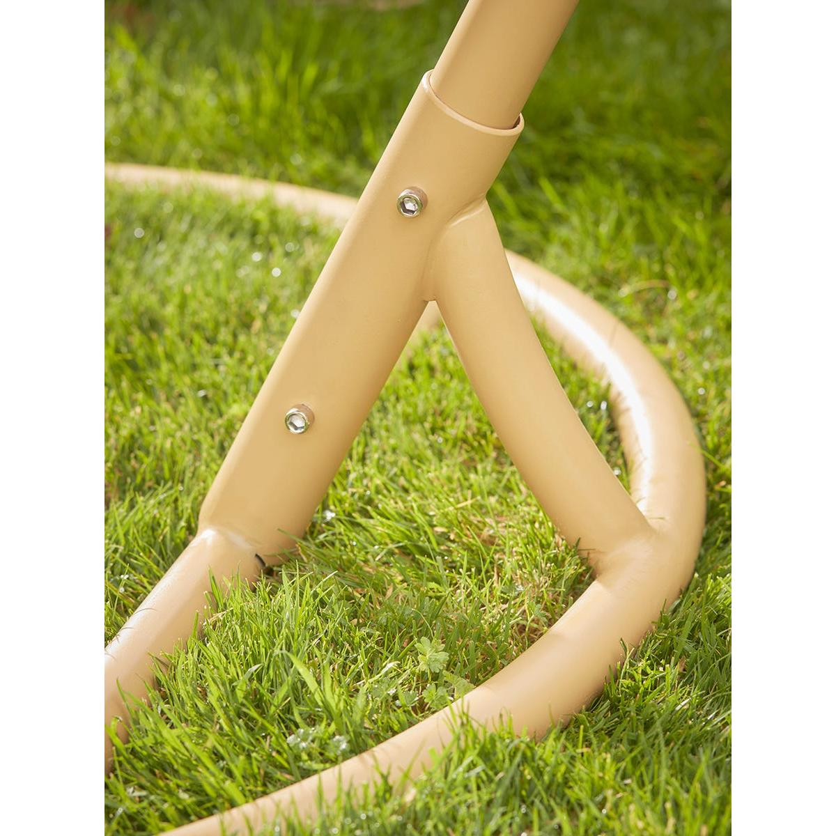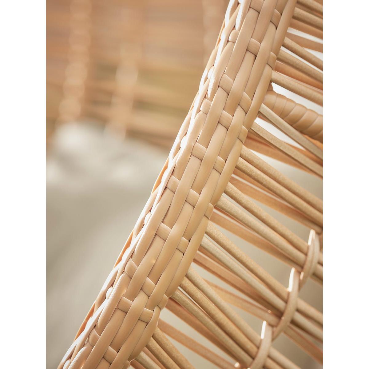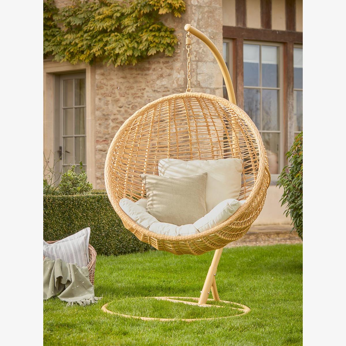A cosy round hanging chair made from authentic looking PE wicker which will quickly become your favourite seat in the garden. With a warm toned natural wicker effect seat, on an iron frame, our Mells Hanging Chair will bring a heady laid back beachy atmosphere to warm afternoons in the garden.  Removable cushions add extra comfort, allowing you to create a peaceful sanctuary in which you can while away a relaxing hour or two. Browse our useful Outdoor Furniture Buying Guide.