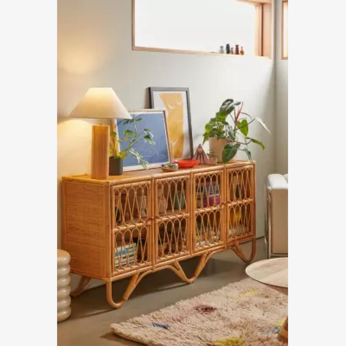 Add modern styling to your mid-century space with the UO exclusive Melody collection. This four-door media console is the perfect solution for storing your TV, record player and other tech, complete with two shelves inside for stacking with books and magazines. Feature a natural rattan construction with woven doors that show off what's inside and dynamic curved legs. *Online return only. This item cannot be returned instore. Please note furniture items currently cannot be shipped to Northern Ireland or The Republic of Ireland. Delivery of large furniture items may take 1-2 weeks and are therefore not eligible for Next Day Delivery.* **Content + Care** \- Rattan, MDF- Wipe clean **Size** \- Product Dimensions: H: 92cm x W: 47cm x L: 186cm- Package Dimensions: H: 95cm X W: 51cm X L: 190cm