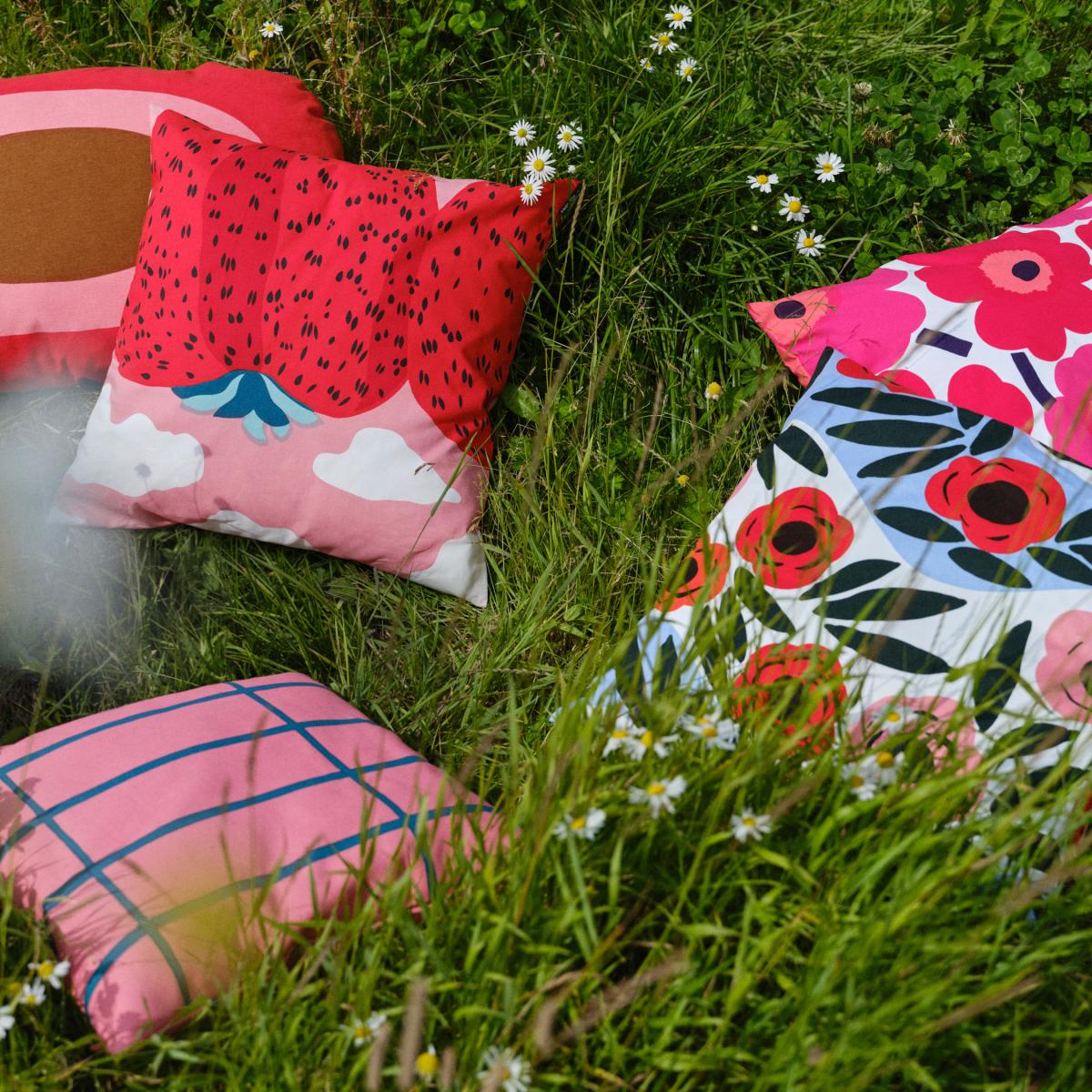 Melooni cushion 47x70 cm from Finnish designers Marimekko is a stylish oval-rectangular design with a circular pattern in different colours that follow the form of the cushion. Place the cushion as an inviting centrepiece of a sofa or the final touch for your bedding.