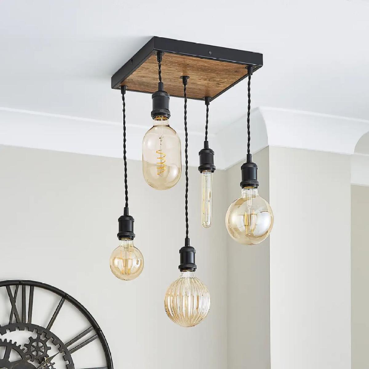 Melrose 5-light pendant ceiling light, featuring a metal ceiling plate with a rustic pine finish, adjustable black cables and exposed lamps. The Melrose 5-light pendant light is a striking statement piece that blends industrial charm with rustic warmth. Designed to add character to modern and vintage-inspired interiors, this pendant light features a square metal ceiling plate with a rich rustic pine finish, bringing a natural, earthy element to its design. Five adjustable black cables suspend the exposed lamps at varying heights, allowing for a customised look that suits different ceiling spaces. The open bulb design enhances the industrial aesthetic while providing ample illumination, making it a perfect choice for dining areas, kitchen islands or loft-style living spaces. Pair with statement filament bulbs to complete the warehouse-style look. Melrose 5-light pendant ceiling light, featuring a metal ceiling plate with a rustic pine finish, adjustable black cables and exposed lamps. The Melrose 5-light pendant light is a striking statement piece that blends industrial charm with rustic warmth. Designed to add character to modern and vintage-inspired interiors, this pendant light features a square metal ceiling plate with a rich rustic pine finish, bringing a natural, earthy element to its design. Five adjustable black cables suspend the exposed lamps at varying heights, allowing for a customised look that suits different ceiling spaces. The open bulb design enhances the industrial aesthetic while providing ample illumination, making it a perfect choice for dining areas, kitchen islands or loft-style living spaces. Pair with statement filament bulbs to complete the warehouse-style look.