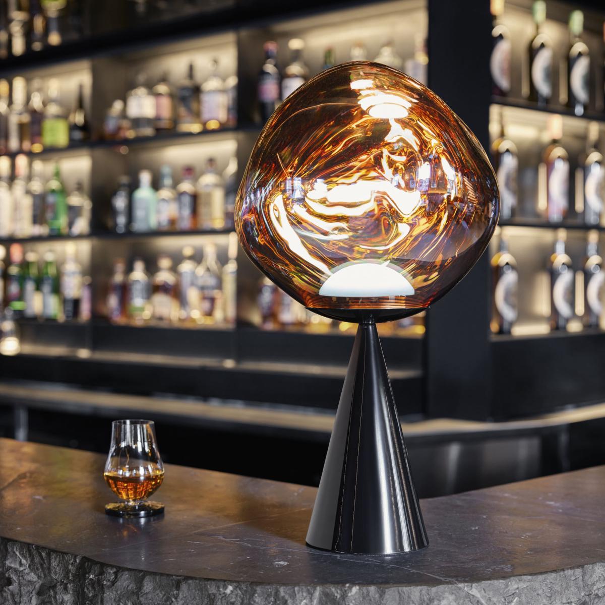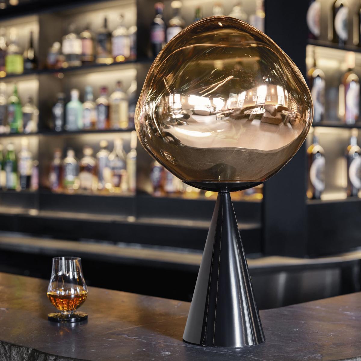 The Melt table lamp is a dynamic light sculpture with infinite reflections... With its soft, domed organic shape, the lampshade evokes a drop of molten glass or metal!