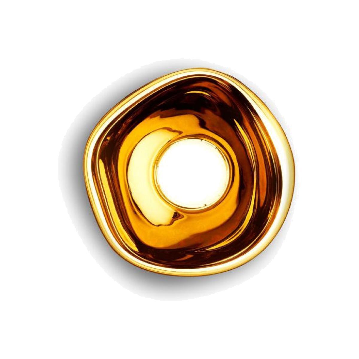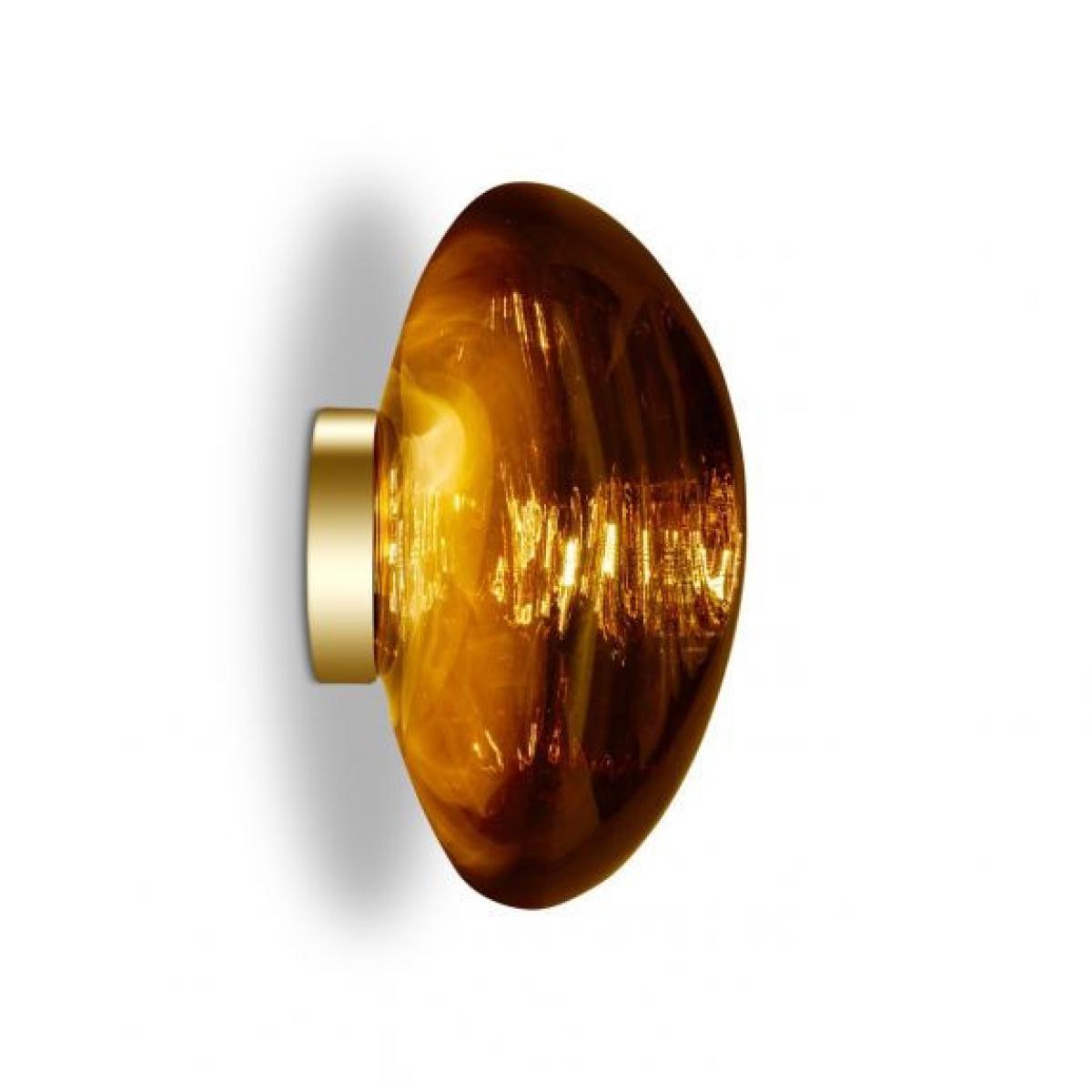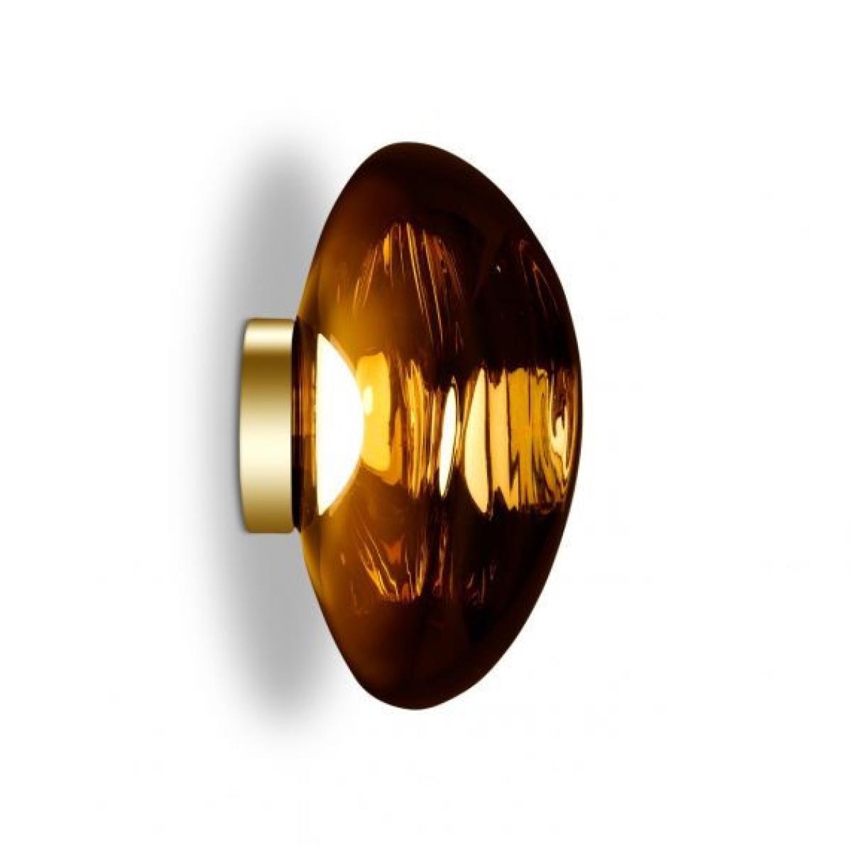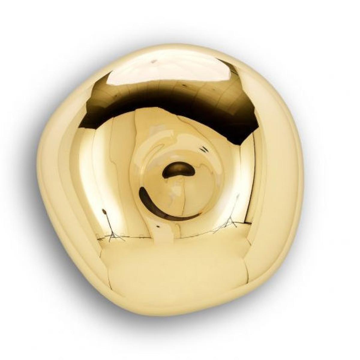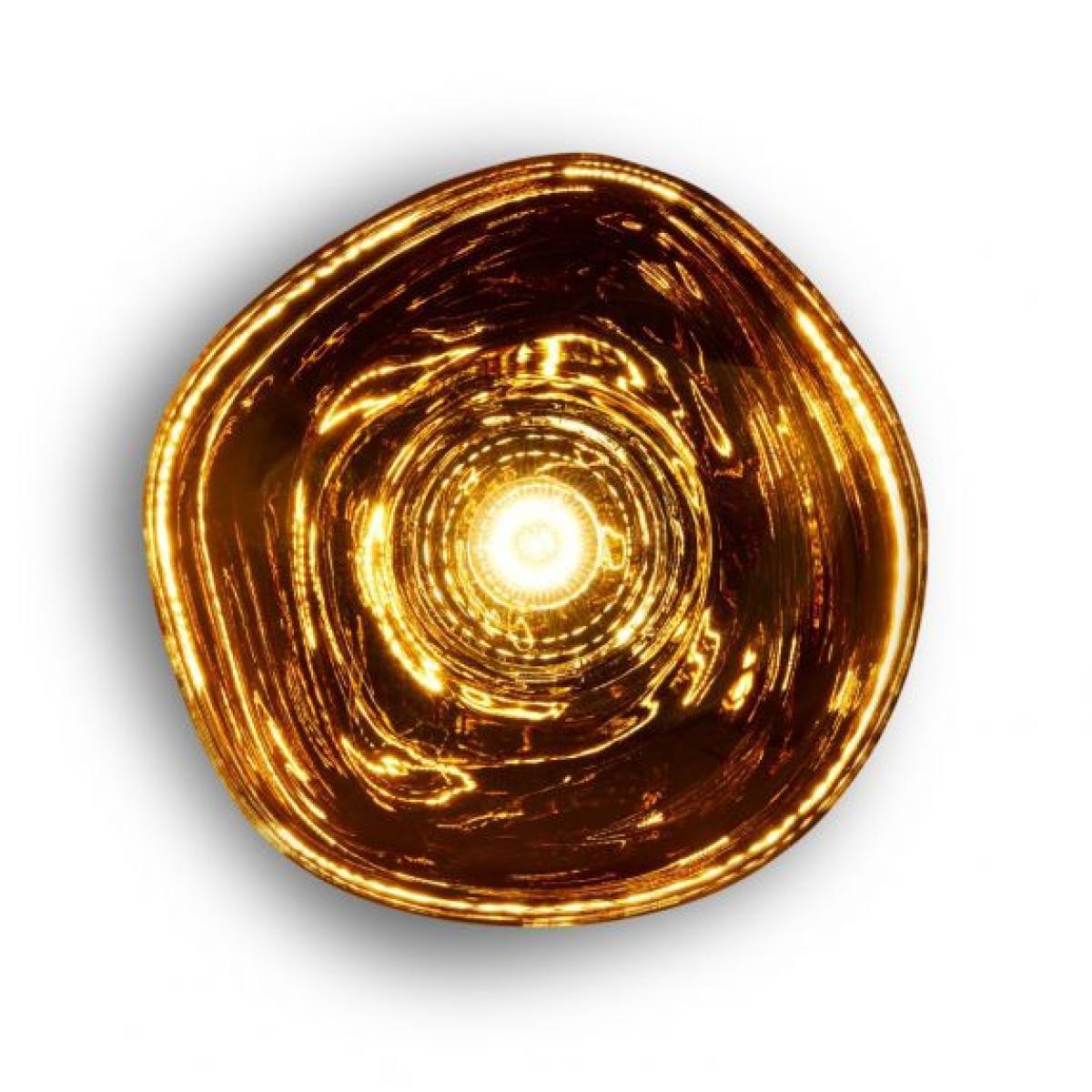 With its soft, rounded, organic shape, Melt is a beautifully warped lamp that evokes a drop of molten glass or metal! Its surface reminds us of the inside of a cast iron glacier or images of space. Tom Dixon has teamed up with the Swedish collective Front to create this “distorted” collection with its fascinating optical effect. When it's on, Melt transforms: it changes appearance and colour for a completely hypnotic effect! This deformed sphere is made of an innovative material: a clever blend of polycarbonate with a few microns of copper, gold or chrome. This very special metallic finish allows Melt to change and look totally different! Indeed, when the light is off, the metallic lampshade is completely opaque and reflective. Once the light is on, the lampshade becomes translucent like glass: the material is dressed in beautiful deep reflections, playing with light, colour, transparency and depth. Energy-efficient, the Melt wall light is equipped with an integrated LED module developed by Tom Dixon (3-year warranty). This LED module offers longer life expectancy, improved energy efficiency and performance, including the possibility of dimming and controlling the light. This integrated LED module is fully serviceable and replacement components are available if needed.