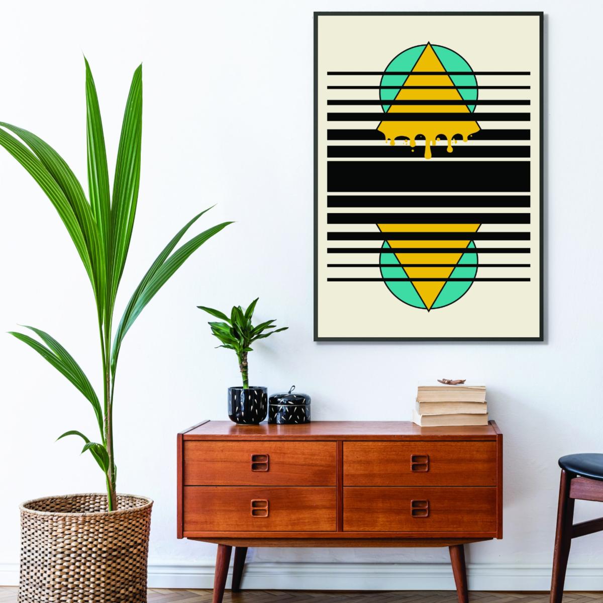 I really like this print for its bold, graphic appeal-it's an eye-catching piece that works well in contemporary or minimalist interiors. The striking combination of colours and geometric shapes makes it versatile for living rooms, offices, or even behind a workspace desk. To maximise its impact, hang it at eye level and pair it with other modern art or neutral furnishings to let the image stand out. For smaller rooms, it can create a focal point, while in larger spaces, it can serve as a statement piece with minimal surrounding decor. Its modern aesthetic makes it easy to incorporate into eclectic schemes or homes with a pop of colour.